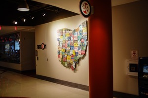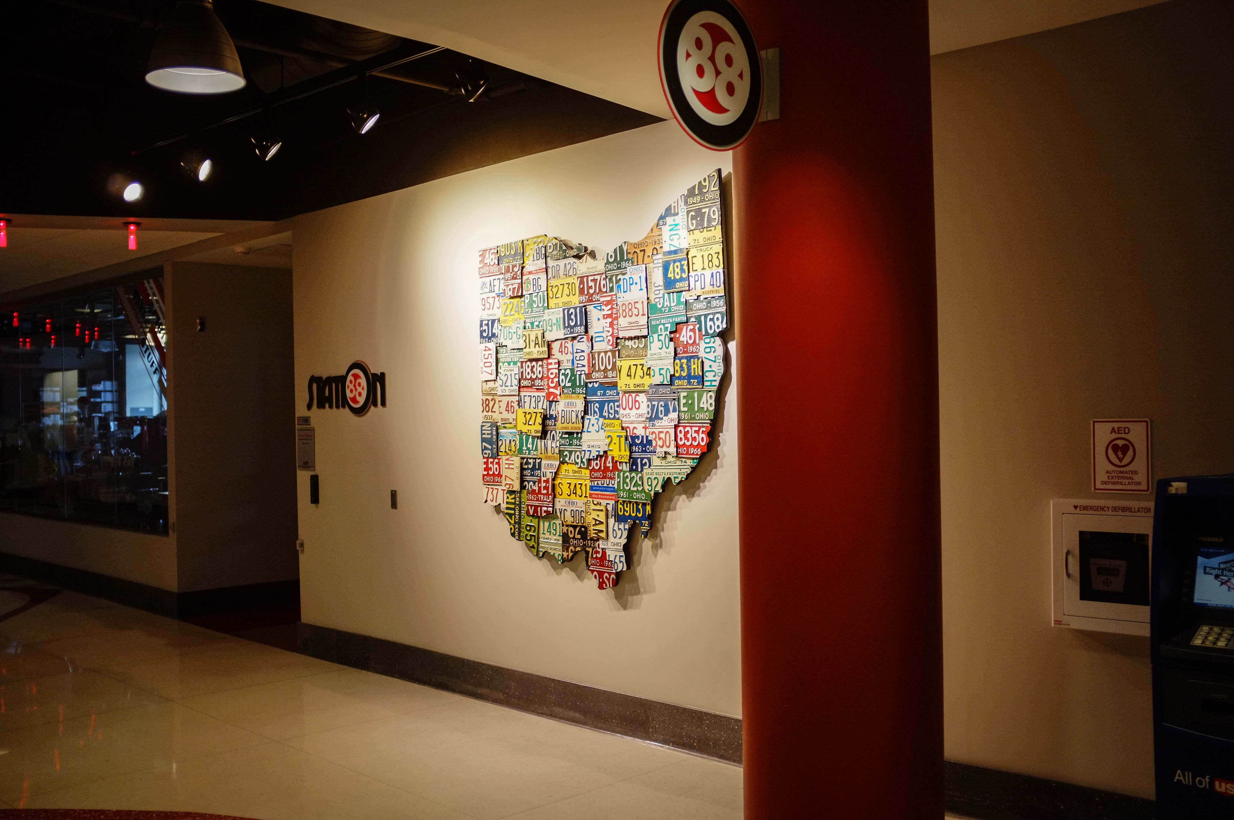 The composition showcases a vibrant artwork made of various license plates arranged in the shape of Ohio, echoing a sense of local pride. The warm, ambient lighting casts a soft glow, adding to the inviting atmosphere of the space. This unique display juxtaposes modern design with nostalgic elements, creating a visually engaging focal point in the hallway.