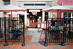 A quaint café scene unfolds with patrons enjoying al fresco dining under pale pink umbrellas. The inviting red entrance beckons amidst a relaxed atmosphere, while plants and flags add a touch of local charm. Soft, natural light filters through, creating a cozy yet vibrant mood that's perfect for leisurely afternoons.