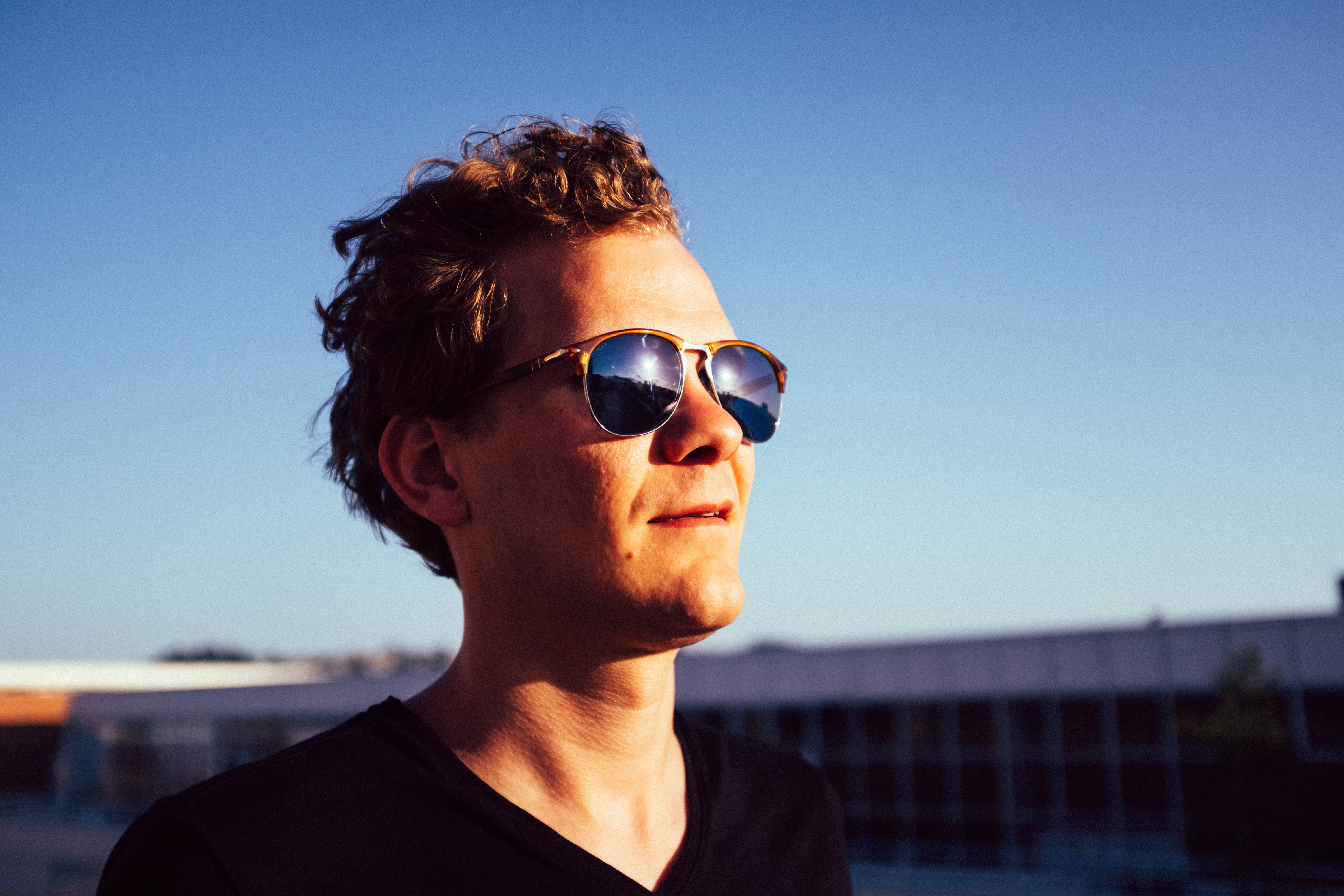 The photograph captures a young man in sunglasses, standing against a clear blue sky with the soft glow of sunset illuminating his features. His relaxed expression and the warm light create a serene and contemplative mood, while the composition highlights the simplicity of everyday moments. The contrast between the shadows and sunlight accentuates his confident demeanor, inviting viewers to pause and reflect.