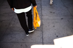 A person strides confidently along a sunlit pavement, their bright orange bag a striking focal point against muted surroundings. The focus on their footwear and the subtle shadow play creates an atmosphere of contemplative movement, suggesting a moment of quiet determination in a bustling urban landscape.