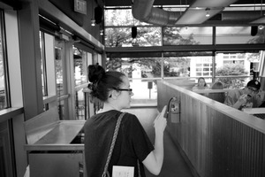 In a bustling cafe, a woman gestures animatedly as she walks past a line of diners. The soft lighting and monochrome palette evoke a sense of nostalgia, emphasizing the candid nature of her conversation. Reflective surfaces and large windows let in glimpses of the world outside, adding to the lively but relaxed atmosphere.