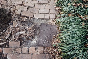 This photograph captures a weathered brick pathway interrupted by a solitary, geometric tile, highlighting the delicate tension between nature and human-made structures. With earthy tones and muted lighting, the mood conveys a sense of quiet contemplation, suggesting stories of growth and change. The composition draws the eye along the winding path, inviting a closer look at the intertwining roots and faded leaves.