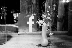 In a black-and-white composition, a delicate vase holds fragile flowers, exuding a sense of tranquility amid the rustic backdrop. The stark contrast between the soft petals and the bold graphic of the Facebook logo hints at the juxtaposition of nature and modern digital life. Warm, diffused lighting enhances the intimate atmosphere, drawing the viewer into a reflective moment.