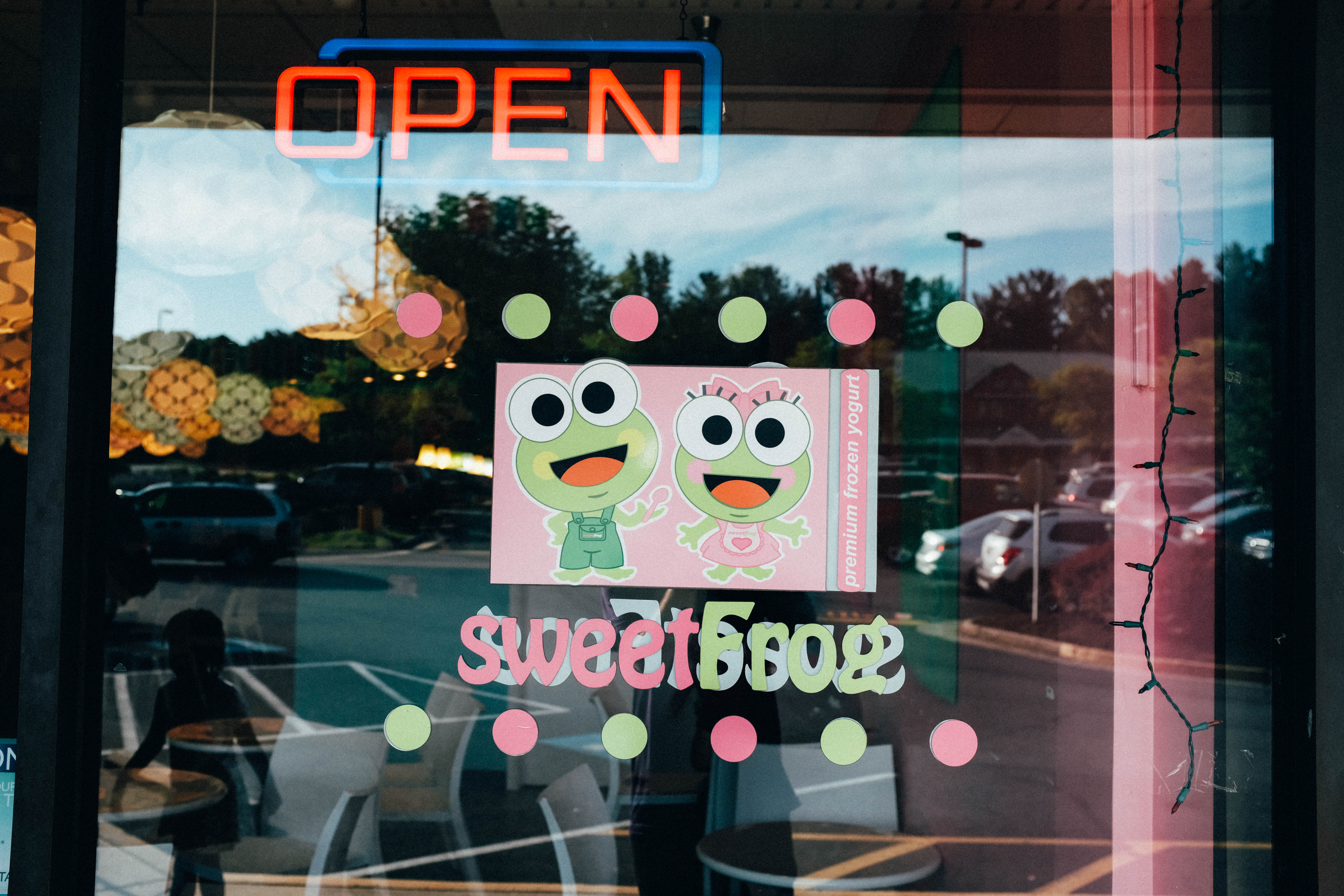 The photograph captures a vibrant storefront adorned with playful, cartoonish characters, inviting passersby in with its cheerful design. A bright 'OPEN' sign glows against the backdrop of the window, while colorful polka dots frame the whimsical imagery of the characters. The overall mood is lighthearted and inviting, enhanced by the warm daylight filtering through the glass, creating a welcoming atmosphere.