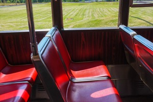 The photograph captures a serene interior of a public transport vehicle, showcasing a row of bright red seats bathed in warm sunlight. The mood is tranquil and reflective, with the lush green landscape visible through the window adding a sense of openness. The composition highlights the interplay of light and shadow, creating a welcoming yet solitary atmosphere.