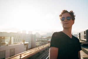 A man stands confidently on a rooftop, bathed in the warm glow of the setting sun. His sunglasses reflect a sense of cool detachment, while the soft backlighting creates a dreamy, ethereal mood, contrasting with the urban backdrop of buildings fading into the distance. The composition emphasizes both his solitude and the expansive cityscape around him.