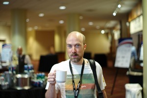 In the foreground, a man with a thoughtful expression holds a cup, embodying a moment of pause amid a bustling environment. Soft lighting highlights his features, while the blurred background hints at a social event, creating an atmosphere of casual interaction. The composition balances focus on the subject with the lively hints of activity surrounding him, suggesting both introspection and the anticipation of connection.