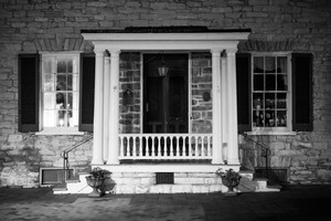 This monochromatic photograph captures a historic stone house's welcoming porch, framed by elegantly detailed columns. The soft glow of the lantern casts a gentle light, contrasting with the deep shadows, creating a serene and slightly mysterious mood. The composition invites the viewer's gaze towards the intricately designed doorway, hinting at stories waiting inside.
