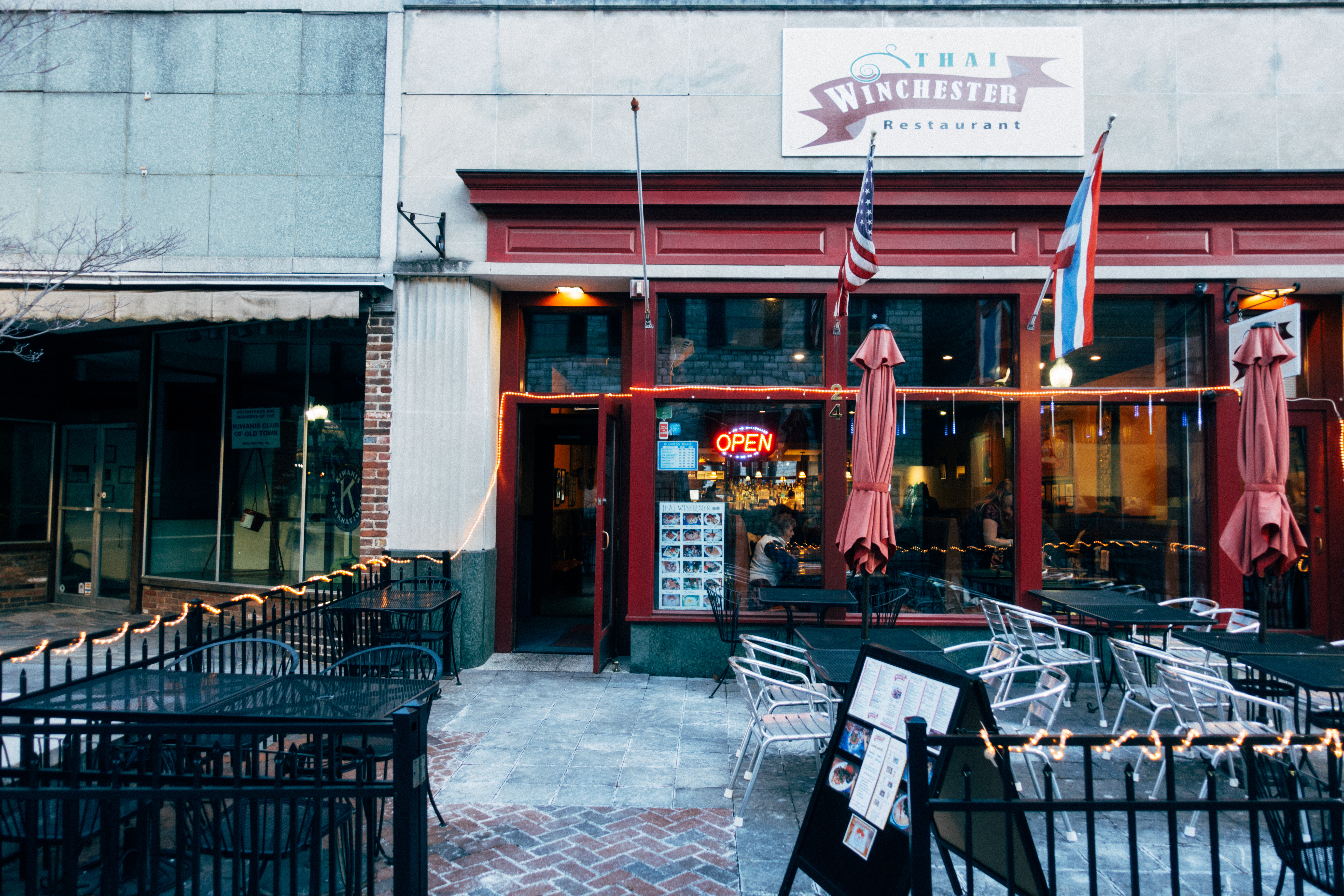 The photograph captures the inviting entrance of the Thai Winchester restaurant, framed by a cozy patio adorned with strings of lights. The warm glow of the 'OPEN' sign juxtaposes the cooler hues of the evening, creating a welcoming atmosphere amidst a quiet urban backdrop. The composition emphasizes the restaurant's charm and the empty outdoor seating, hinting at the anticipation of diners in search of comfort and flavor.