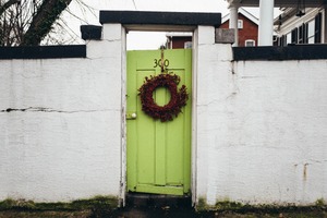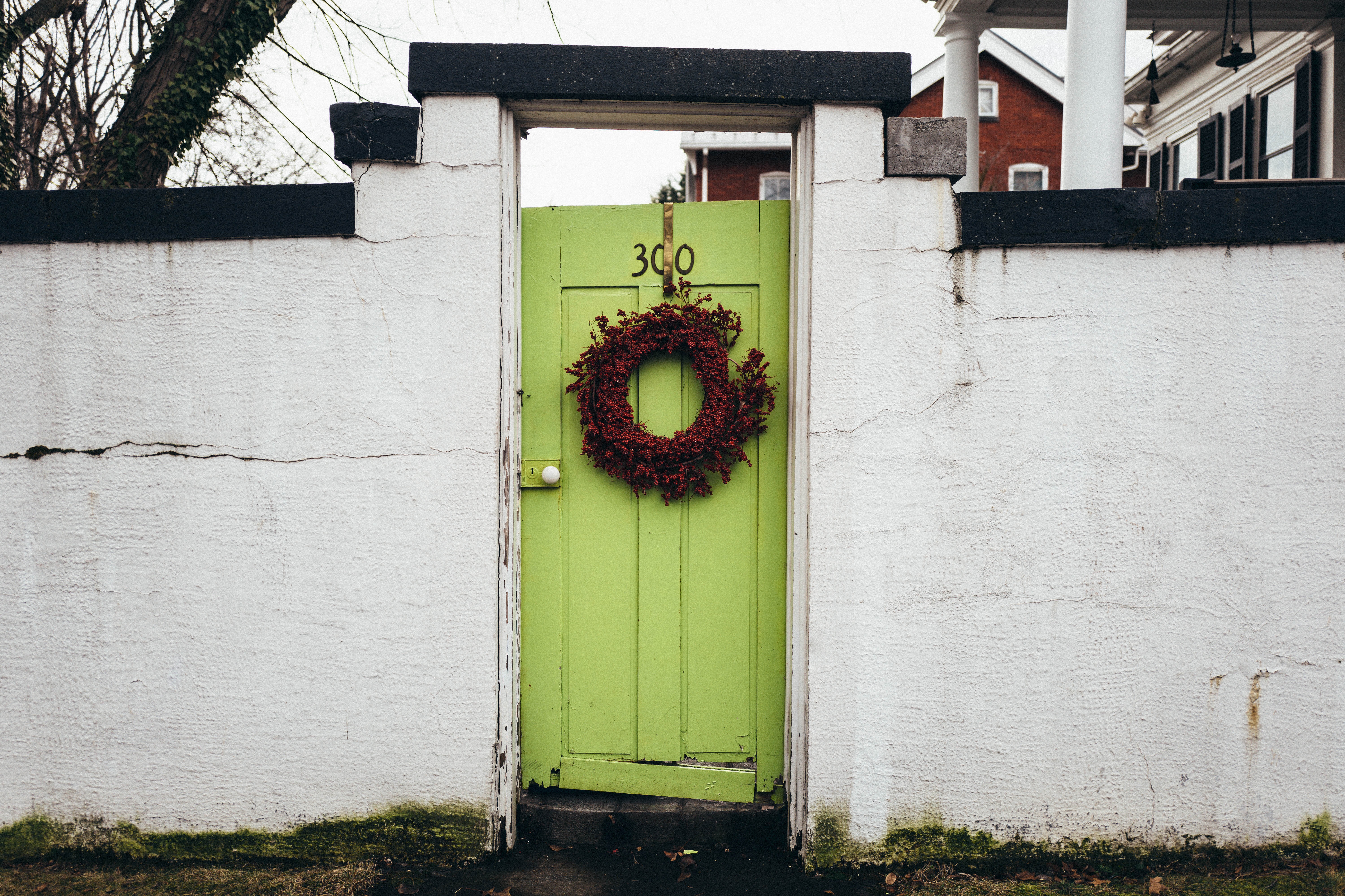 A vibrant green door stands out against a stark white wall, adorned with a rustic wreath that adds a touch of warmth. The composition evokes a sense of inviting curiosity, framed by the soft light of an overcast day. The contrasting colors and textures create a charming yet slightly mysterious atmosphere, suggesting stories waiting to be uncovered behind the door.
