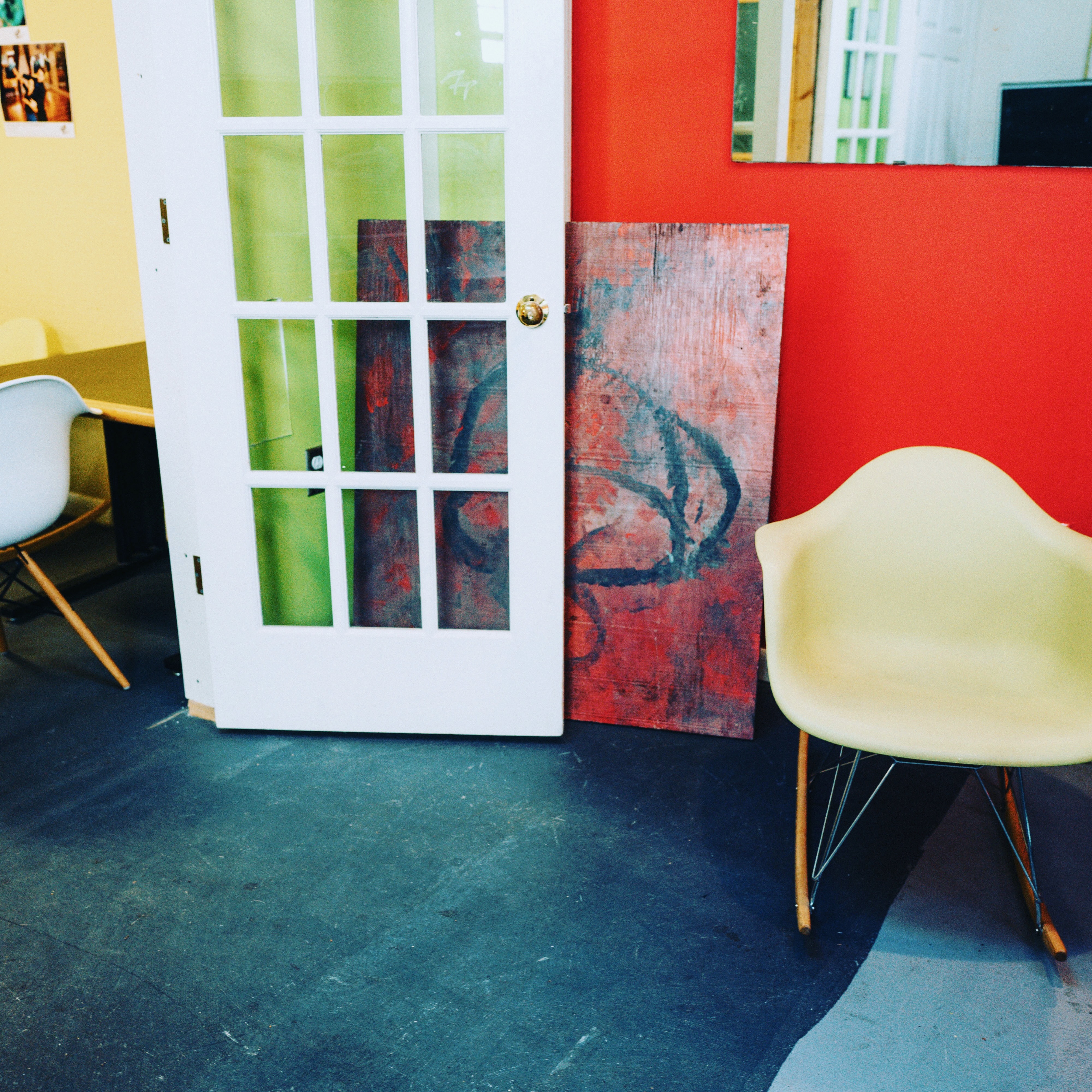 This photograph captures a vibrant corner of a space, where a white glass-paneled door stands adjacent to a red wall and a piece of abstract art. The warm colors and casual placement of furniture evoke a creative and lively atmosphere. Soft, diffused lighting highlights the textures and colors, creating a dynamic interplay that invites exploration.