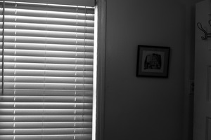This black and white photograph captures a serene corner of a room, emphasizing the interplay of light and shadow through partially closed blinds. The soft illumination highlights the textures of the walls and a small framed picture, evoking a sense of calm introspection. The composition draws the eye towards the subtle details, inviting viewers to pause and reflect in the quiet space.