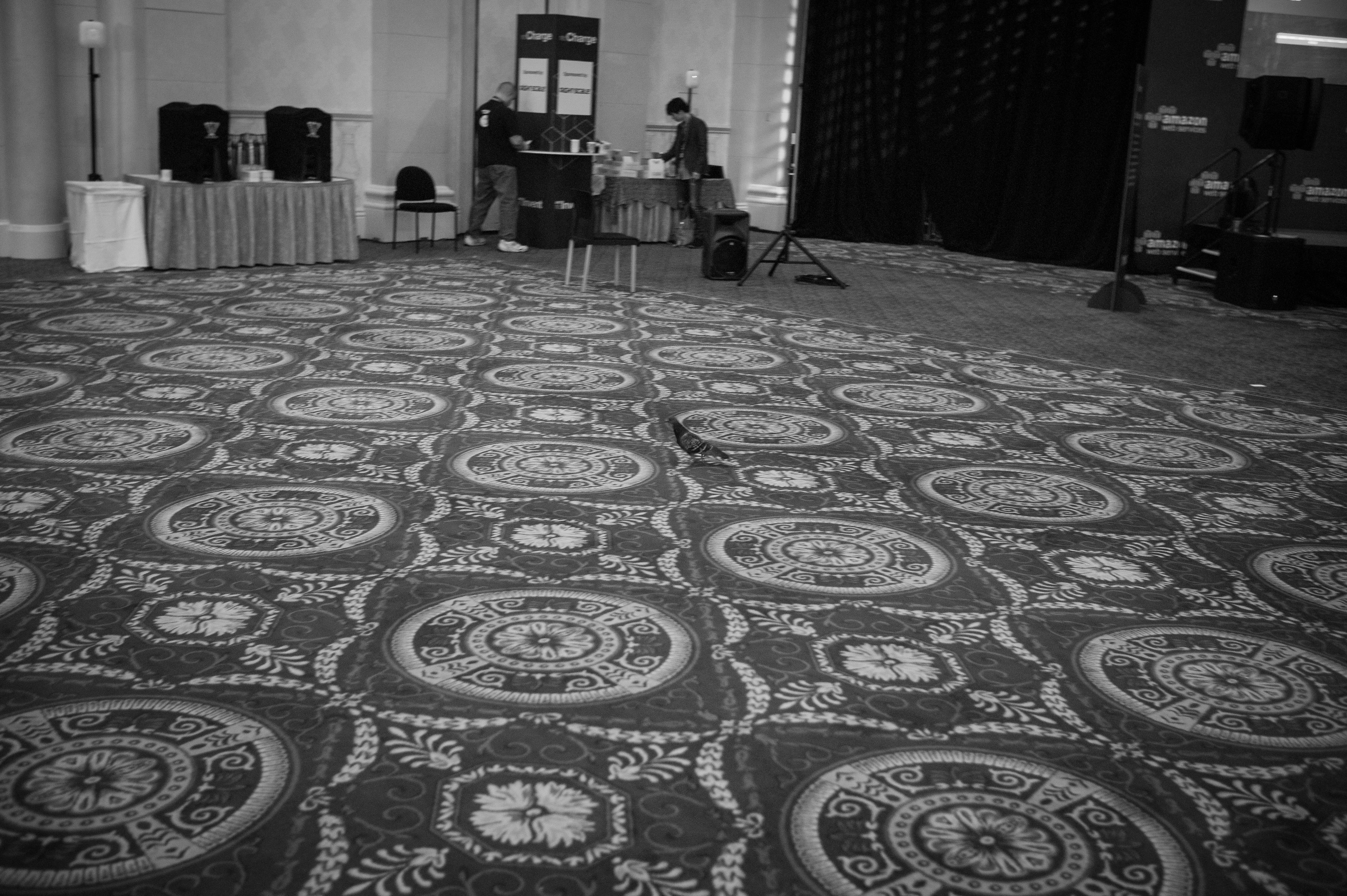A stark black and white photograph captures the quiet moments before an event, where empty chairs and a patterned carpet stretch into the distance. A soft, diffused light filters through, creating a somber yet contemplative mood, highlighted by hints of bustling preparation in the background. The composition invites the viewer to reflect on the anticipation of gatherings and the stories that will soon unfold in the space.