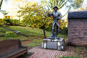 A bronze statue stands proudly in a serene park, capturing the historical essence of its figure. The soft morning light filters through the trees, casting a warm glow on the vibrant autumn leaves surrounding the scene, enhancing the tranquil atmosphere. A weathered wooden bench sits nearby, inviting contemplation and reflection on the legacy represented before it.