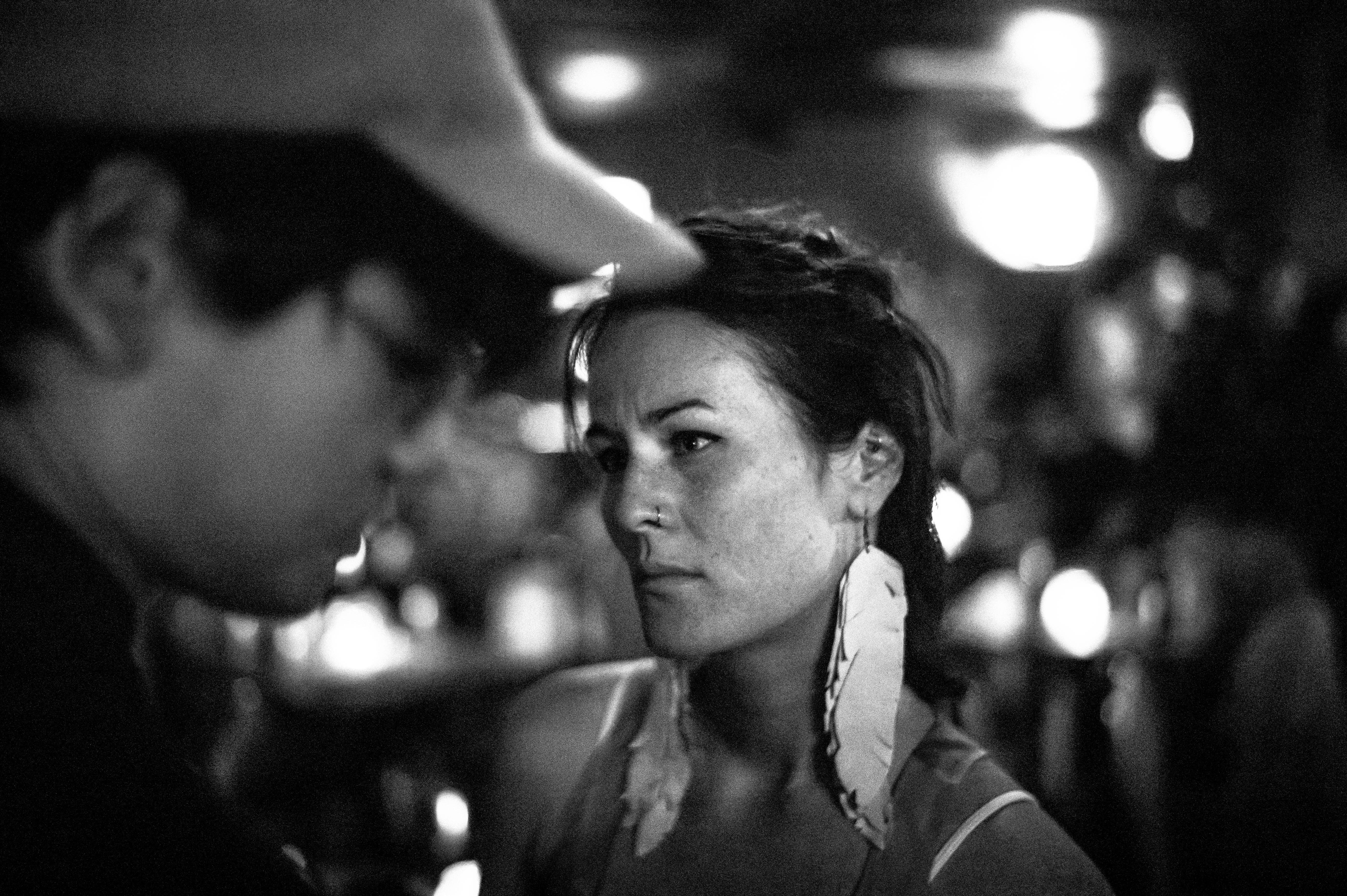 In this moody black-and-white photograph, a woman with striking feather earrings gazes intently, her expression a mix of contemplation and intensity. The soft, low lighting casts shadows that enhance the intimate atmosphere, while a male figure partially in frame adds to the sense of personal connection or confrontation. The composition draws the viewer's eye to the subject's face, capturing an unguarded moment in a lively yet subdued environment.