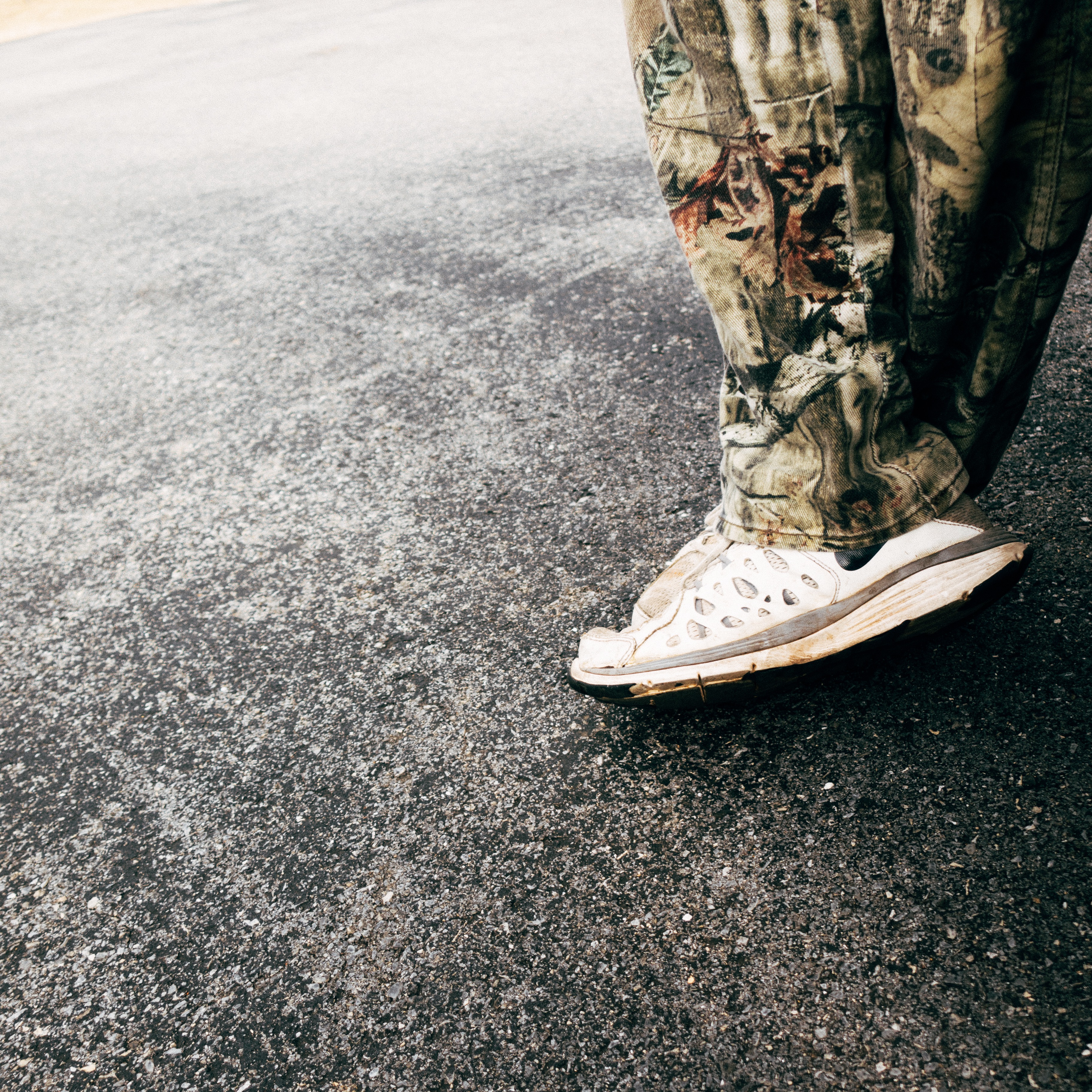 The photograph captures a low-angle view of a person’s feet, clad in worn sneakers and camouflaged pants, juxtaposed against a textured asphalt background. The muted tones and natural daylight create a sense of authenticity, evoking a feeling of casual, transient moments in everyday life. The focus on the feet suggests movement and the unassuming nature of the subject, inviting viewers to ponder the story behind the scene.