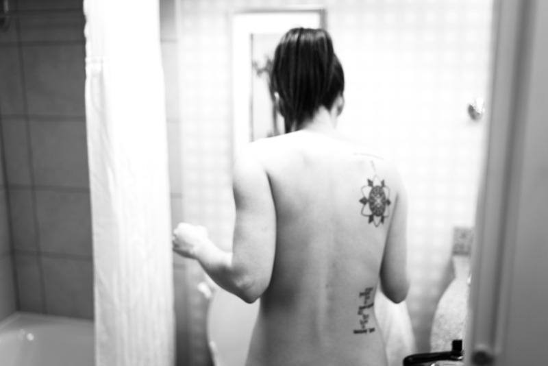 In a softly lit bathroom, a figure stands with their back to the camera, revealing intricate tattoos that adorn their skin. The composition captures a moment of intimacy and vulnerability, enhanced by the monochrome palette that evokes a sense of simplicity and introspection. The interplay of light and shadow adds depth to the scene, inviting reflection on both the physical and emotional aspects of the moment.