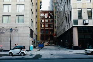 The photograph captures a narrow alley framed by stark modern buildings contrasting with the weathered brick of an older structure in the background. Two figures stroll along the sidewalk, adding a touch of life to the otherwise quiet atmosphere, accentuated by soft, muted lighting. The composition highlights the tension between old and new architecture, evoking a sense of urban transition and nostalgia.