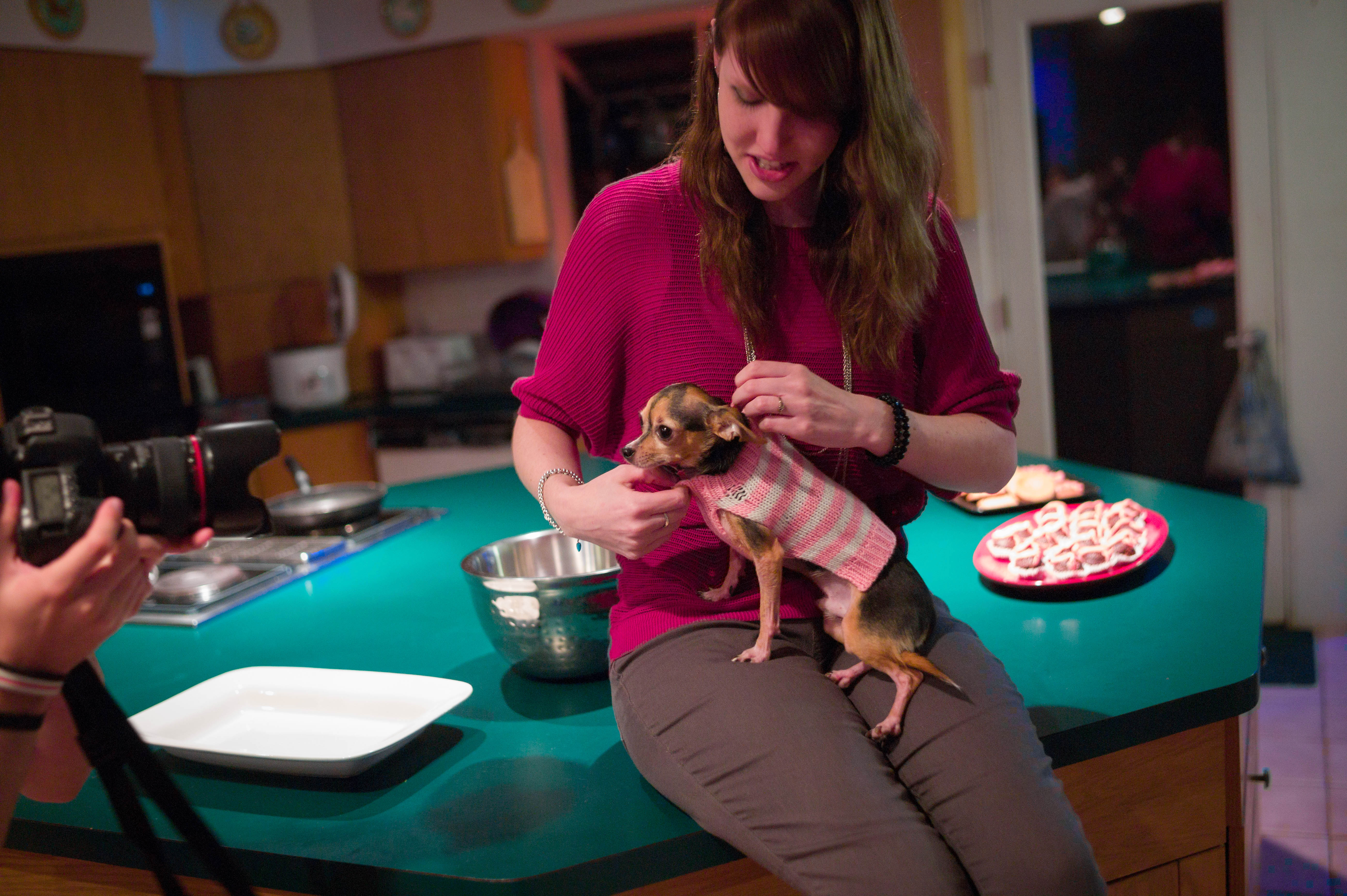A warm and intimate moment unfolds in a home kitchen, where a woman lovingly cradles a small dog dressed in a charming sweater. The soft lighting casts a gentle glow, enhancing the cozy atmosphere as she interacts with the pet, while a friend captures the moment from behind a camera. The vibrant colors of the countertop and snacks add a playful touch to the scene, inviting viewers into this delightful domestic setting.