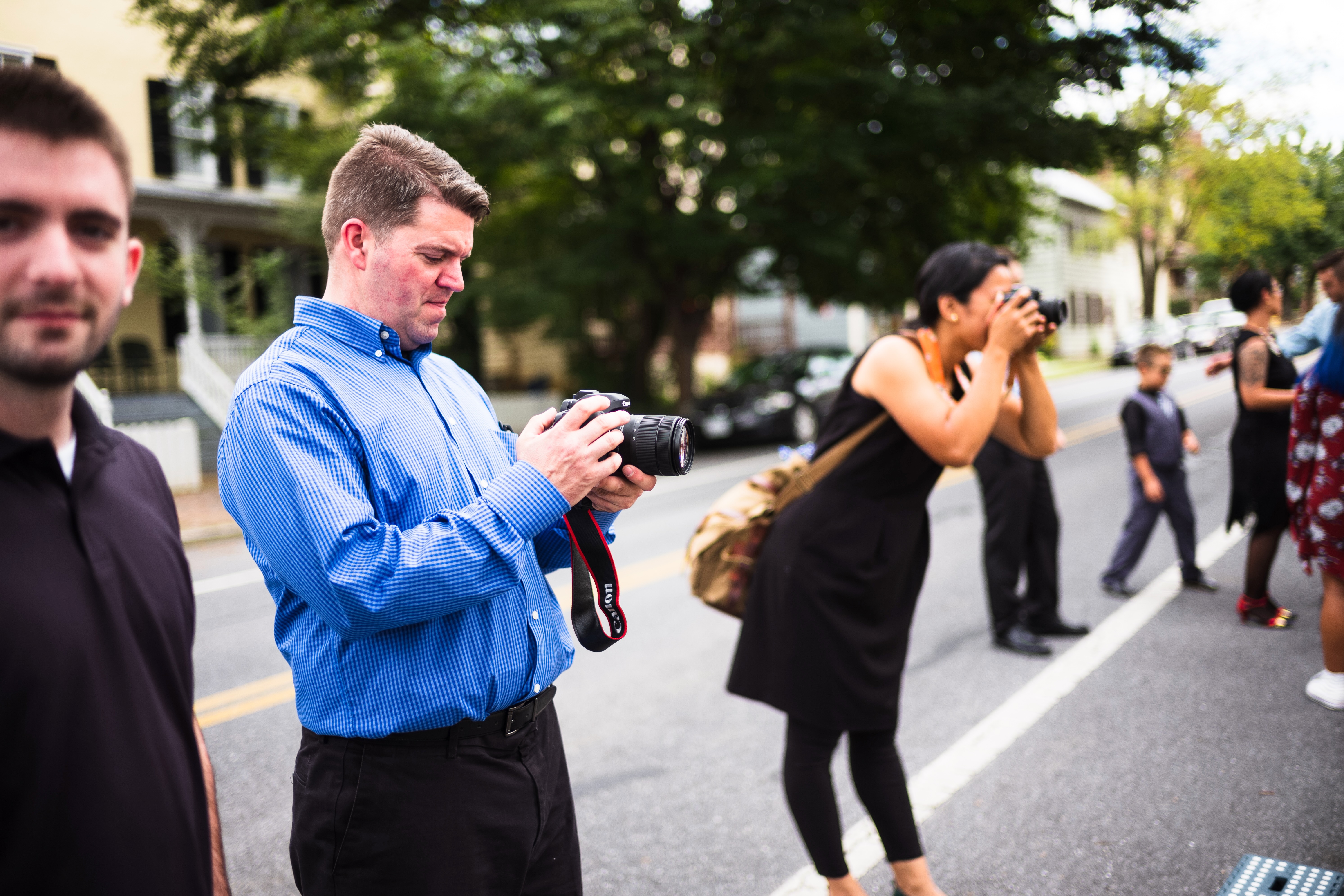 In this vibrant street scene, a group of photographers captures the essence of a lively gathering. The mood is dynamic and enthusiastic, with the balance of soft natural light illuminating the subjects and the surrounding environment. Each person holds a camera, indicating a shared passion for photography amidst the bustling backdrop of a neighborhood setting.