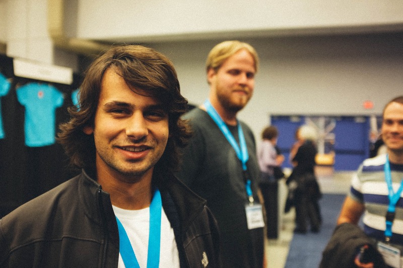 The photograph captures a group of young men at a lively event, with one individual prominently smiling in the foreground. The soft lighting and muted colors create a relaxed atmosphere, while the blue accents from their badges and clothing provide pops of color against the darker backdrop. The slight blurring of the background hints at a bustling environment, adding to the sense of camaraderie and engagement among the attendees.