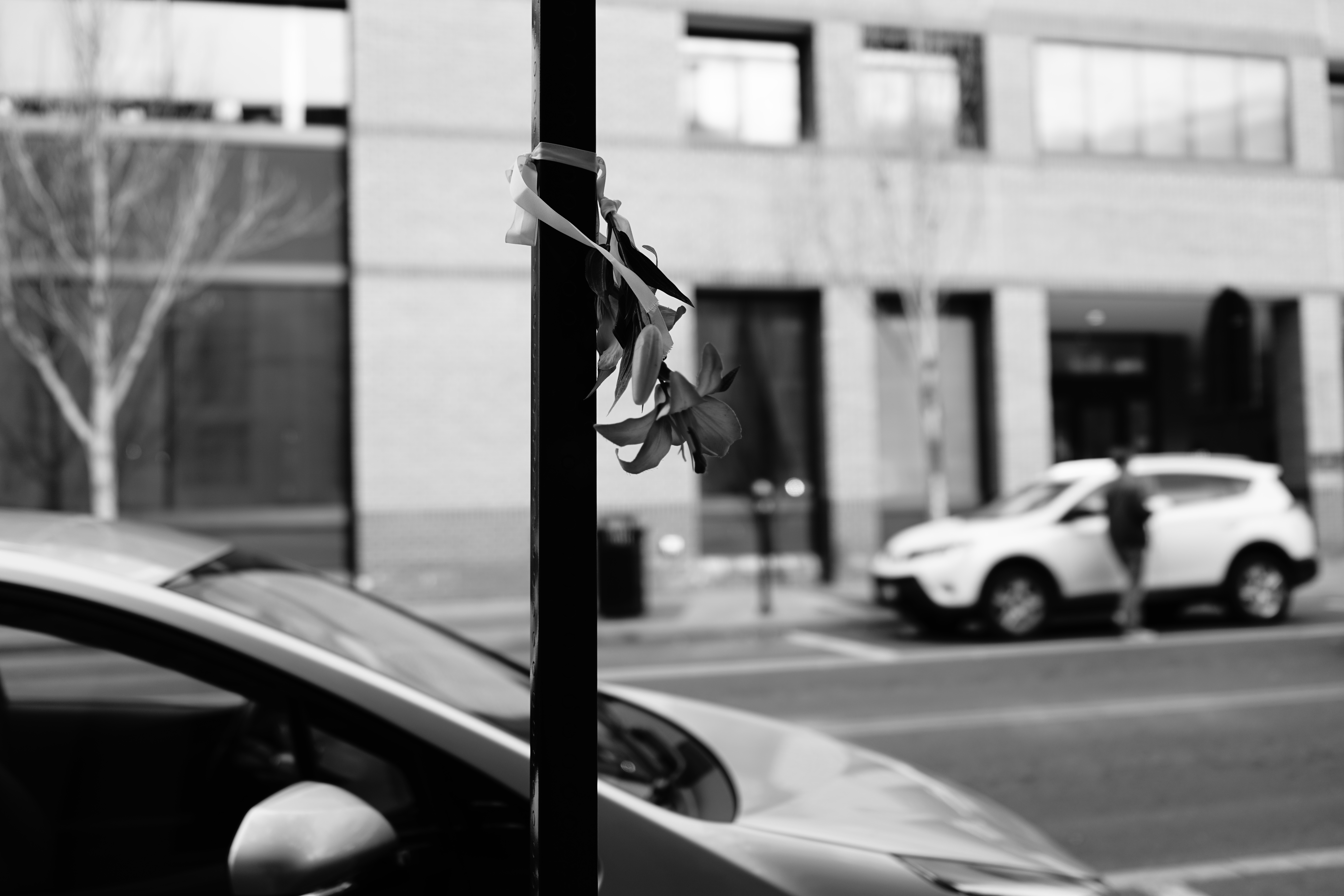 In this monochromatic scene, a vibrant floral ribbon clings to a street pole, contrasting starkly with the shadowy background. The soft focus on nearby vehicles and passersby evokes a sense of solitude and contemplation, as if capturing a fleeting moment in a busy world. Structures loom behind, their muted tones amplifying the ephemeral beauty of the ribbon as a poignant reminder of something lost.