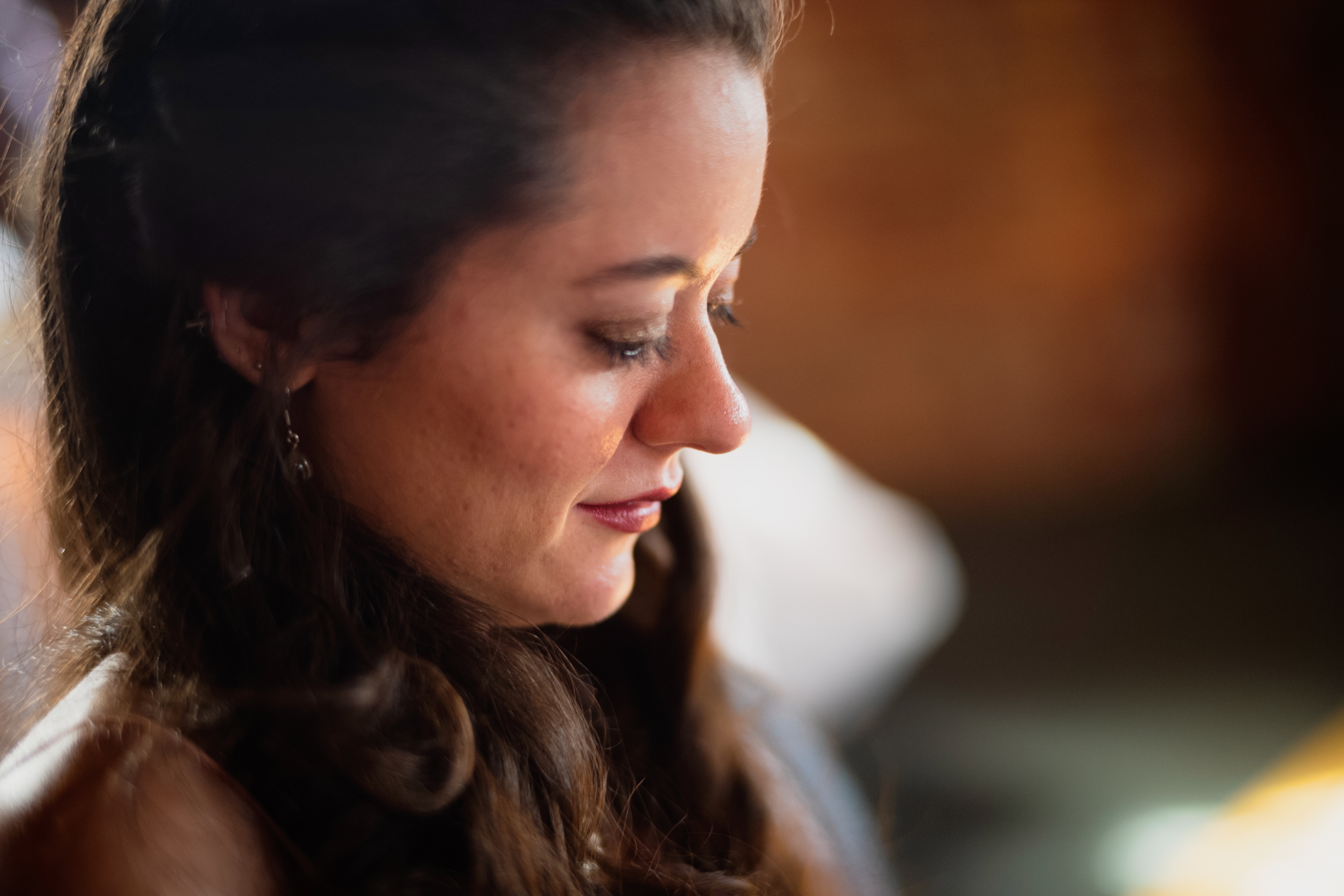 The photograph captures a side profile of a woman lost in thought, her eyes gently closed, evoking a sense of tranquility and introspection. Soft, natural lighting bathes her face, highlighting her features and adding warmth to the scene. The blurred background, with hints of rustic textures, complements the intimate mood, drawing focus to the serenity of her expression.