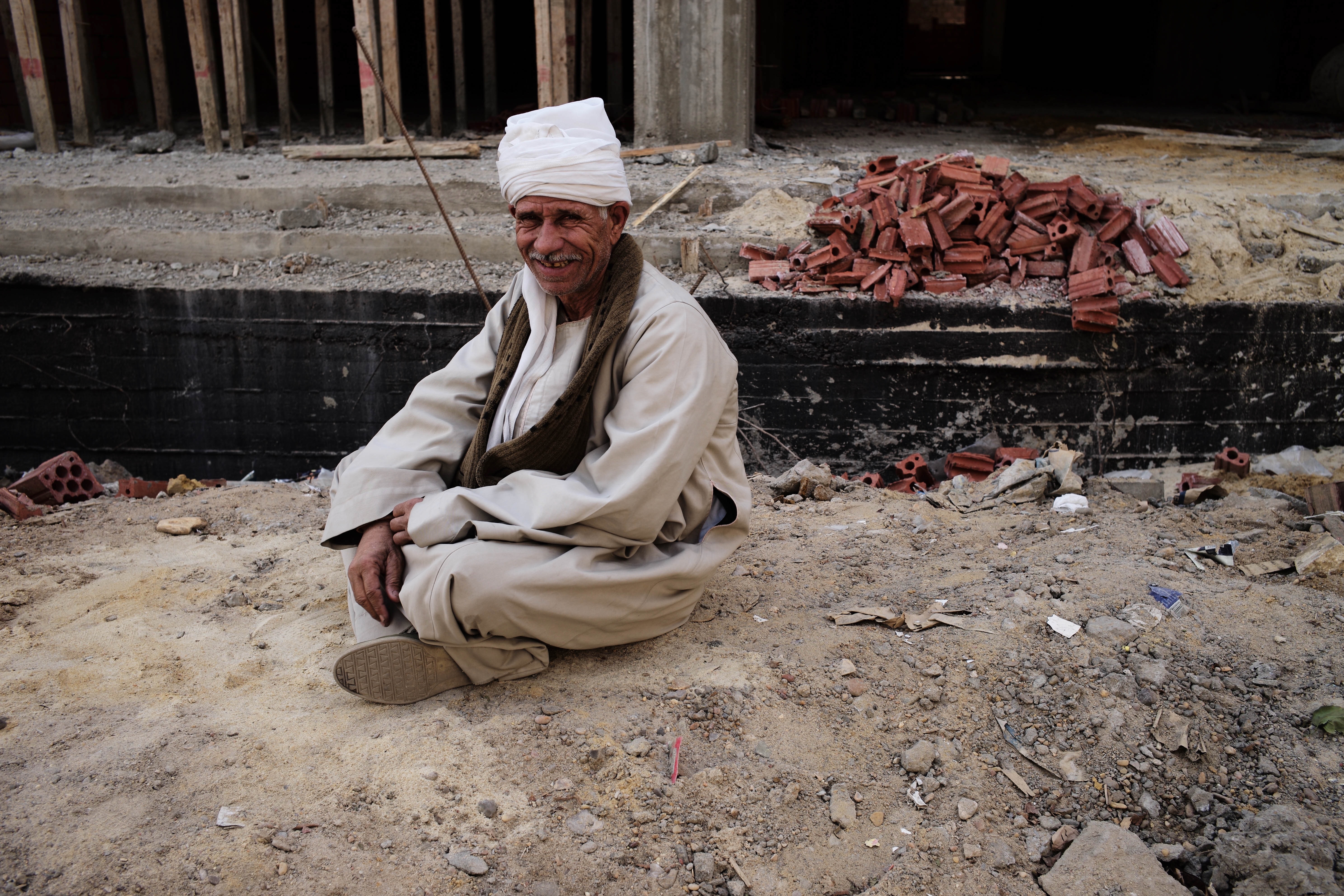 A weathered yet joyful man sits on the sandy construction site, exuding warmth and resilience. His genuine smile contrasts with the chaotic backdrop of bricks and machinery, embodying a sense of hope and community amidst hard labor. Soft natural light envelops the scene, highlighting the textures of the earth and the man's worn attire.