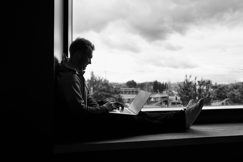 Framed by a large window, a solitary figure sits in contemplative silence, engrossed in a laptop. The moody, monochromatic tones enhance the sense of introspection, while the soft, diffused light from the overcast sky creates a tranquil atmosphere. The composition highlights the contrast between the subject's focused demeanor and the expansive, blurred background, evoking a feeling of isolation amidst a bustling world.