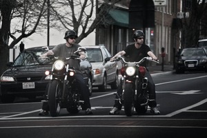 This photograph captures two motorcyclists poised at a city intersection, exuding a sense of camaraderie and adventure. The muted colors and soft evening light create a moody atmosphere, while the focused expressions of the riders add an edge of anticipation. The urban backdrop, with parked cars and faint tree silhouettes, frames the central figures, emphasizing their readiness to embrace the open road.