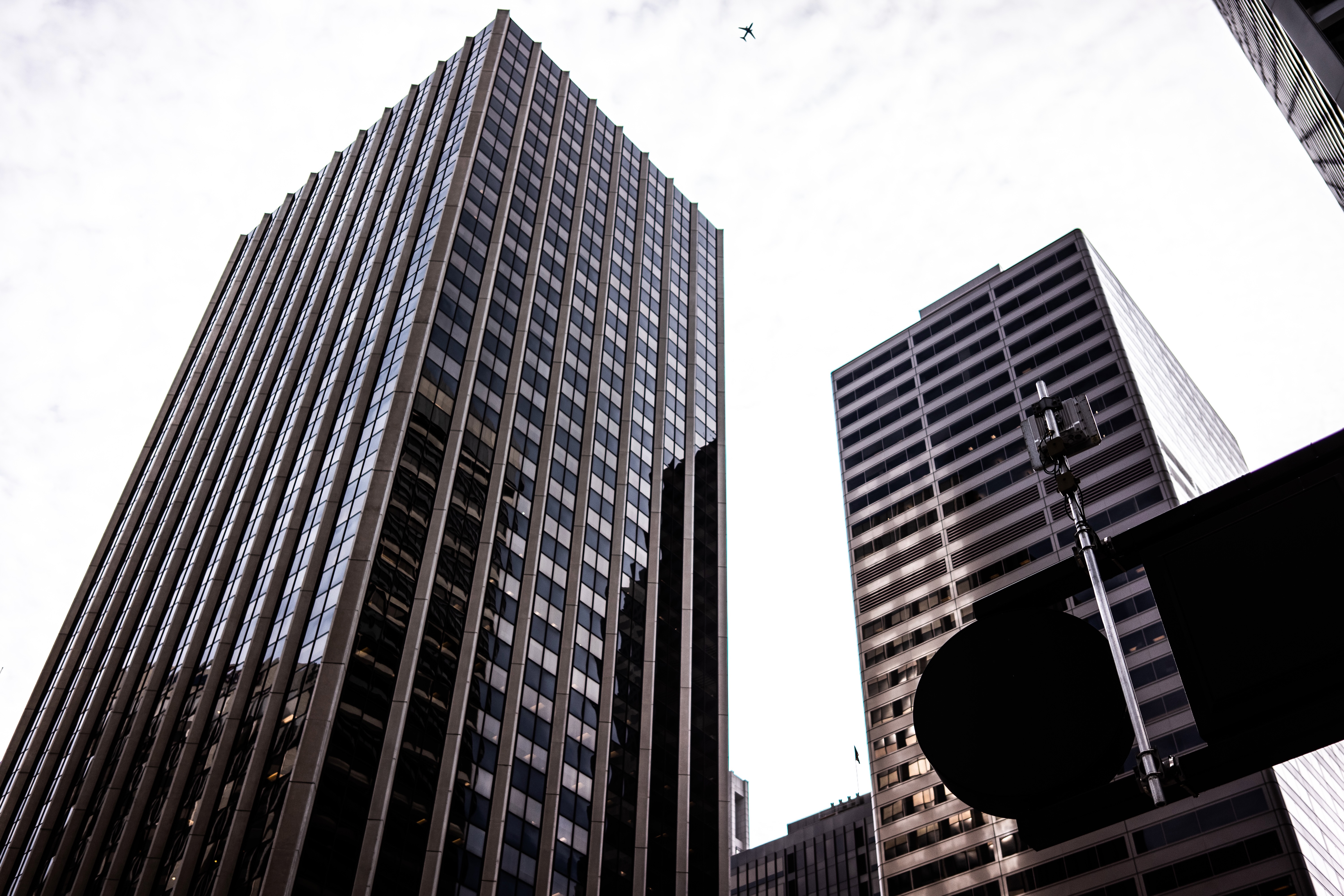 The photograph captures towering skyscrapers reaching toward a cloudy sky, their reflective glass facades glimmering with hints of light. The upward perspective gives a sense of grandeur, while an airplane glides effortlessly above, hinting at the city's vibrant energy. The composition balances sharp architectural lines against soft clouds, creating a dynamic yet tranquil urban scene.