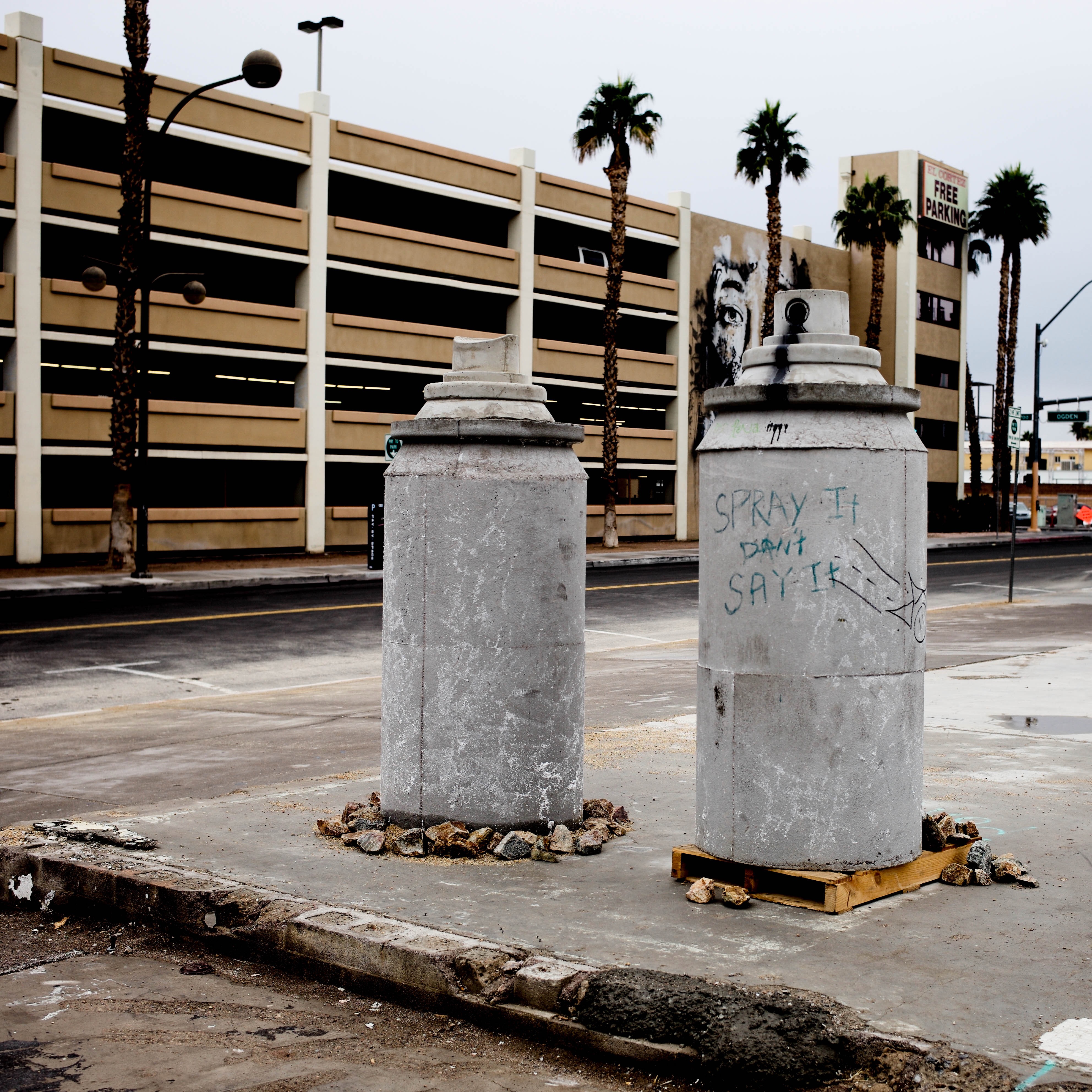 This photograph captures two concrete pillars, weathered and adorned with graffiti that speaks to urban life and expression. The overcast sky lends a muted atmosphere, while palm trees and a parking structure hint at a larger cityscape nearby. The composition emphasizes the stark contrast between nature and man-made structures, evoking a sense of isolation amidst urban development.