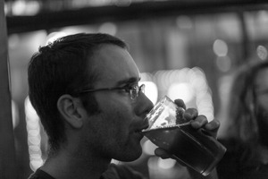 In a dimly lit setting, a man savors his drink, his profile illuminated by soft bokeh lights in the background. The monochrome tones add a touch of nostalgia, evoking a sense of intimacy and contemplation. His focused expression juxtaposes the lively ambiance of the surroundings, creating a moment of stillness amidst the vibrancy.