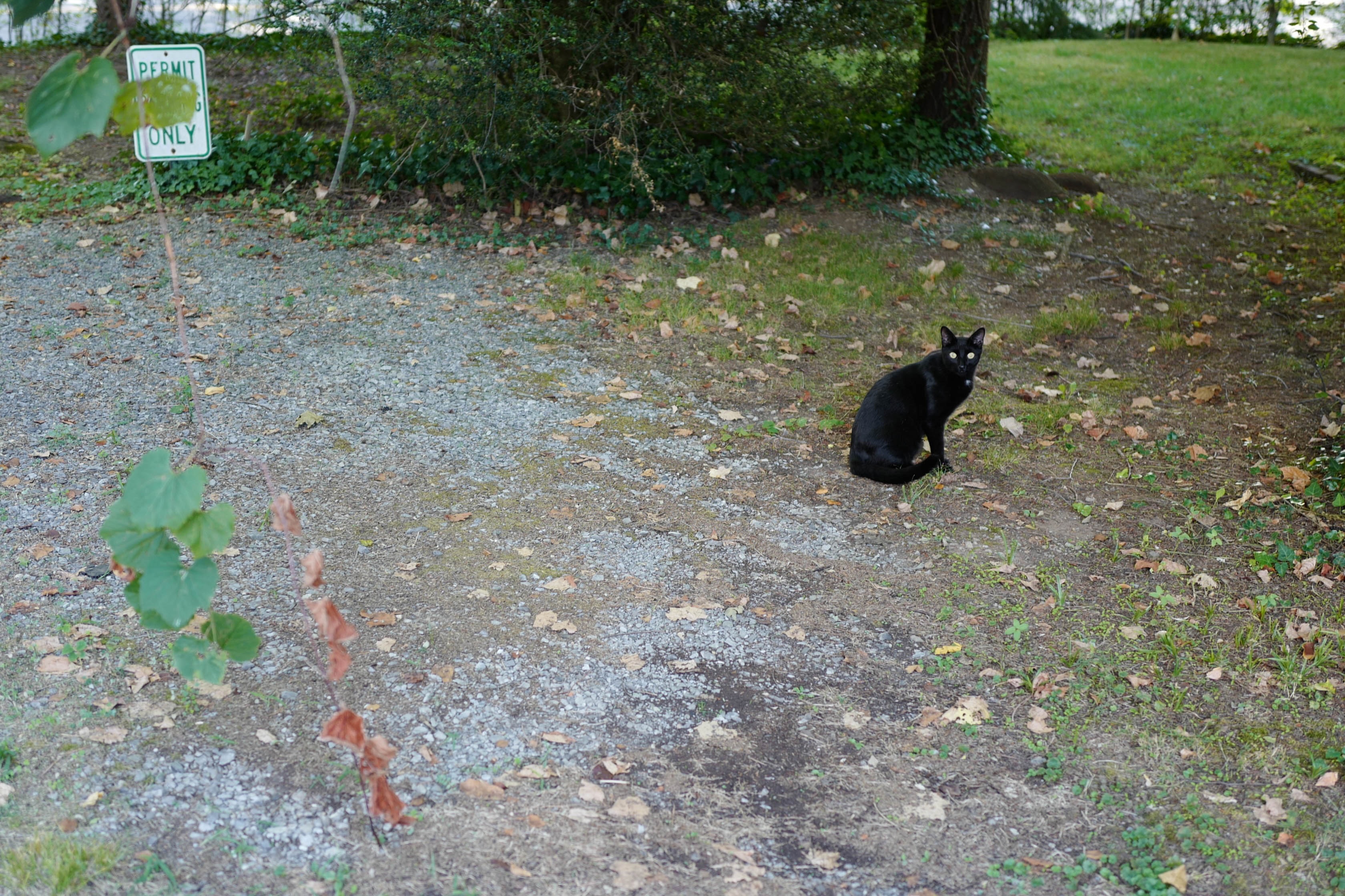In a serene outdoor setting, a black cat sits alert amidst scattered leaves and gravel, casting an air of curiosity. The soft, natural light enhances the scene, gently illuminating the cat's glossy fur and the surrounding greenery. The composition frames the cat as the focal point, creating a tranquil yet mysterious mood.