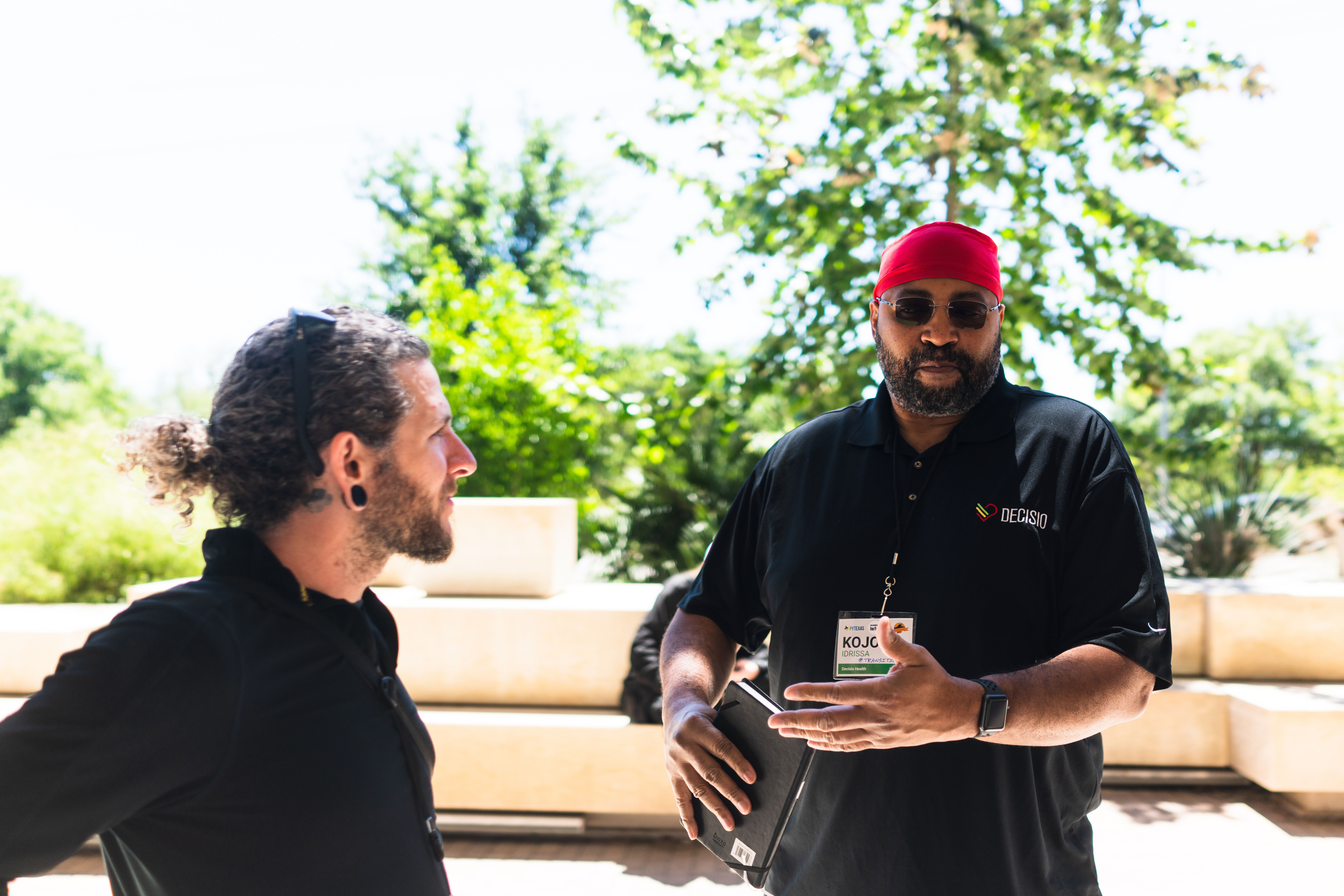 Two individuals engage in a thoughtful discussion amidst a verdant backdrop. The bright, natural light accentuates their features, creating a relaxed yet focused atmosphere. The composition showcases both the subjects while highlighting the lush greenery surrounding them, enhancing the sense of camaraderie and connection.