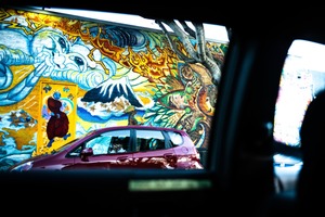 The photograph captures a vibrant mural brimming with color and intricate designs, framed by the interior of a car. A red vehicle is parked in the foreground, contrasting the dynamic patterns of flames, clouds, and nature in the background, creating a sense of lively urban energy. The lighting enhances the mural's vivid hues, setting a playful yet engaging mood.