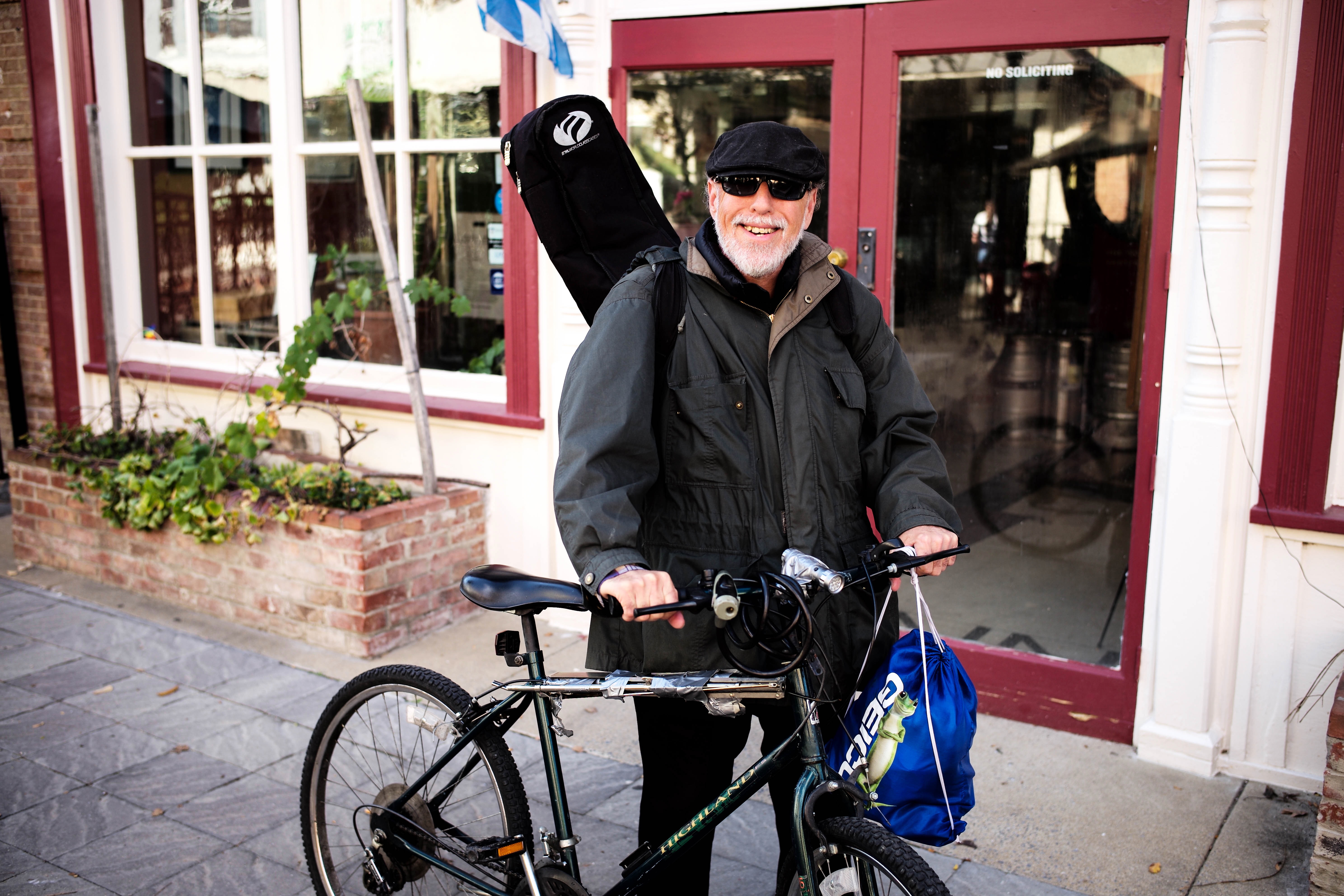 A smiling older man stands confidently beside his bicycle, exuding a sense of adventure. Dressed in a warm coat and hat, he holds a guitar case on his back, suggesting a creative spirit. The soft daylight illuminates the scene, highlighting the inviting colors of the brick and window frames behind him, creating a cheerful and vibrant atmosphere.