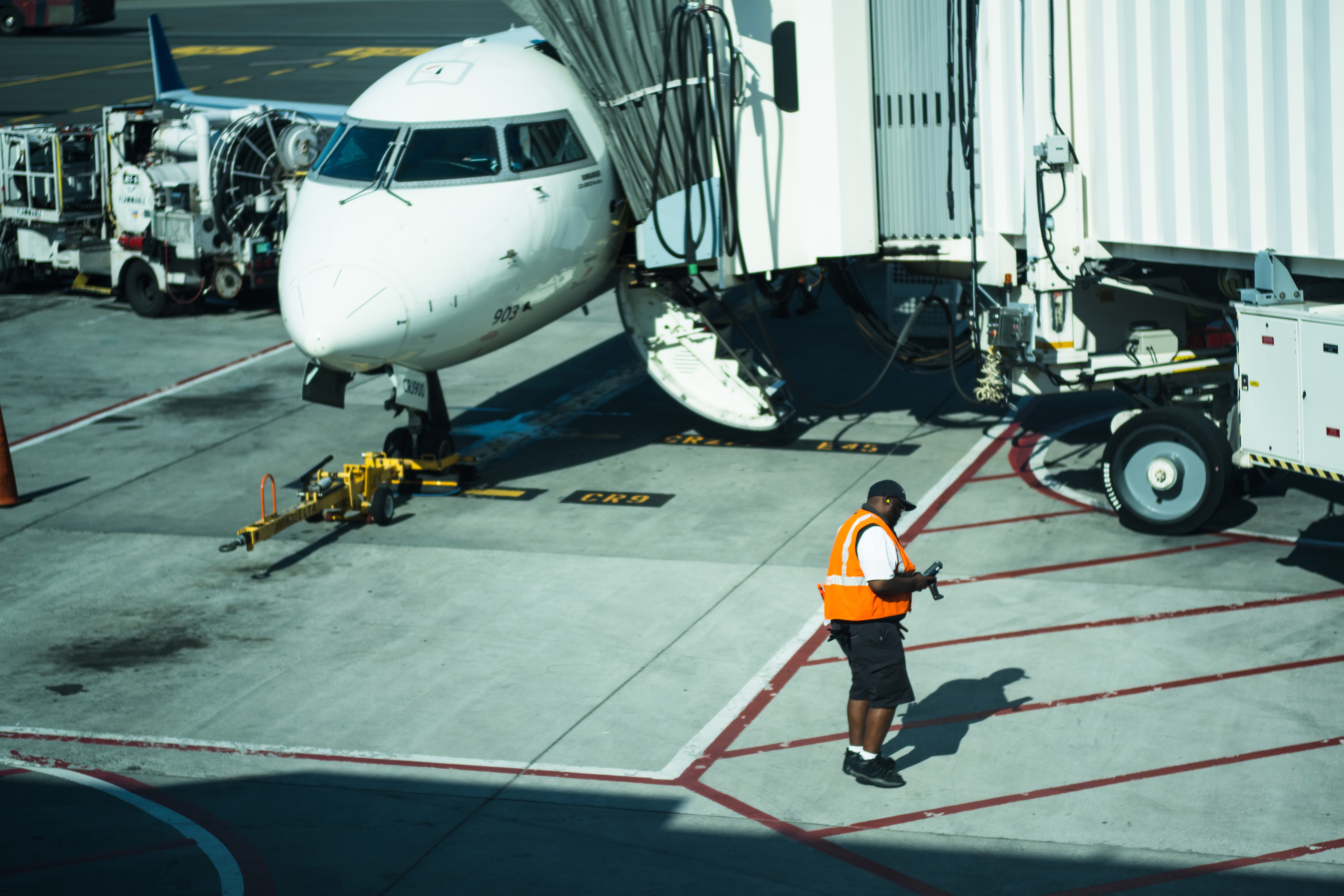 A ground crew member, clad in a bright orange vest, stands on the tarmac, checking his device amid the hustle of airport operations. The composition features a close-up of a parked airplane, with vibrant sunlight casting sharp shadows on the concrete, creating a sense of urgency and focus. The scene conveys a busy yet organized atmosphere, highlighting the critical role of airport personnel in aviation logistics.