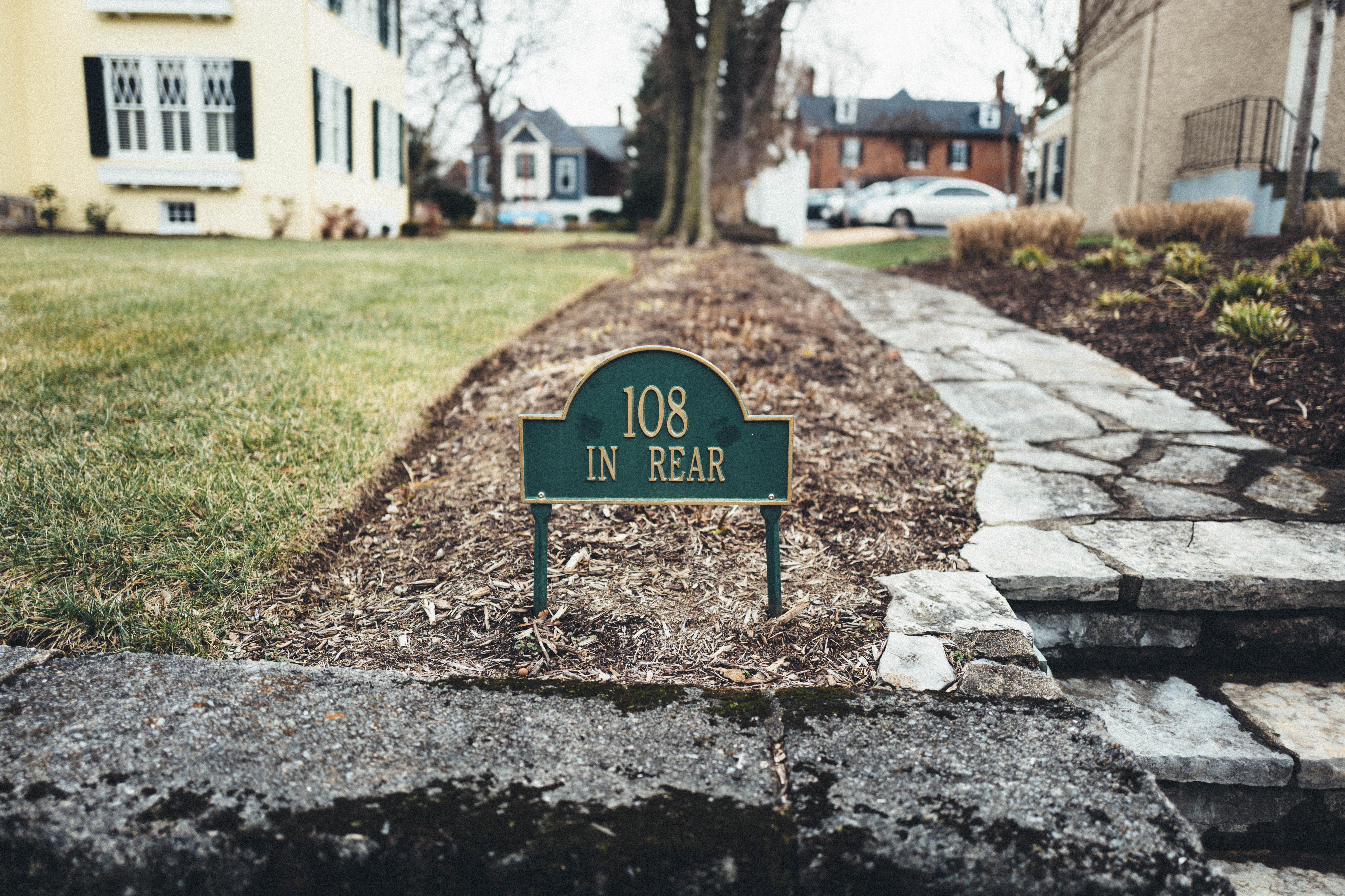 A green sign reading '108 IN REAR' stands prominently in a calm suburban landscape. Soft, natural light casts a gentle glow on the well-kept grass and stone pathway, emphasizing the serene and inviting mood of the scene. The composition draws the eye to the sign, suggesting a hidden charm just beyond view, evoking curiosity about what lies ahead.