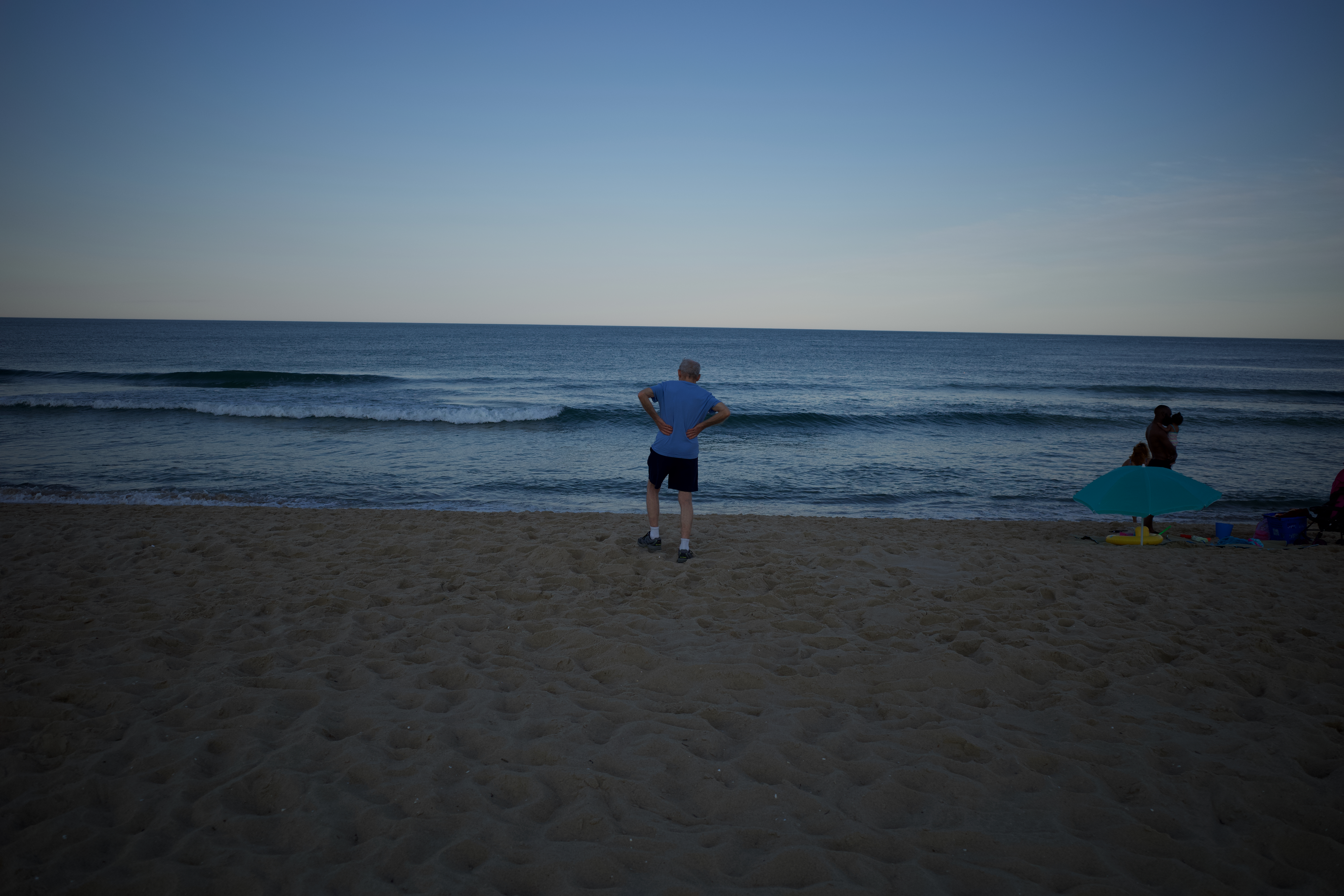 In the fading light of day, an older man stands contemplatively on a sandy beach, gazing out at the gentle waves. The composition captures a serene mood, with the calm ocean contrasting the soft, warm hues of the sky. A figure nearby engages in leisure activities, adding a subtle sense of life to the tranquil scene.