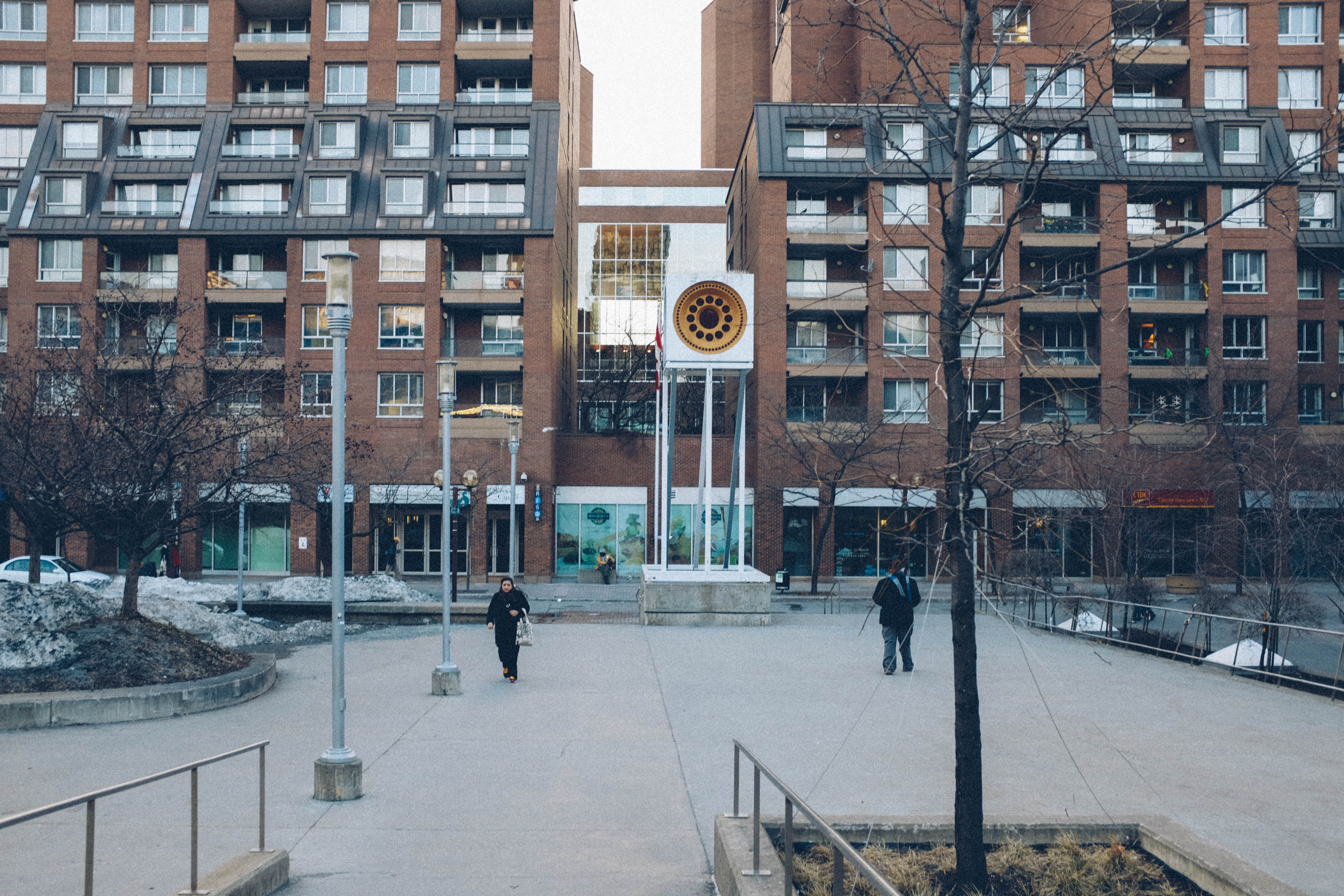 This photograph captures a quiet urban plaza framed by austere brick buildings and stark winter trees, suggesting the chill of early evening. Two figures move through the space, adding a sense of scale and human presence against the architectural backdrop. Soft, diffused lighting enhances the muted colors and adds a contemplative mood to the scene.