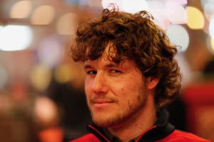 In this intimate portrait, a young man with tousled curls offers a subtle smirk, suggesting a mixture of confidence and playfulness. The warm, blurred background filled with soft lights enhances the approachable mood, creating a sense of nostalgia and warmth. The composition draws the viewer in, highlighting his thoughtful expression against the vibrant backdrop, encapsulating a moment of quiet reflection amidst the bustle.