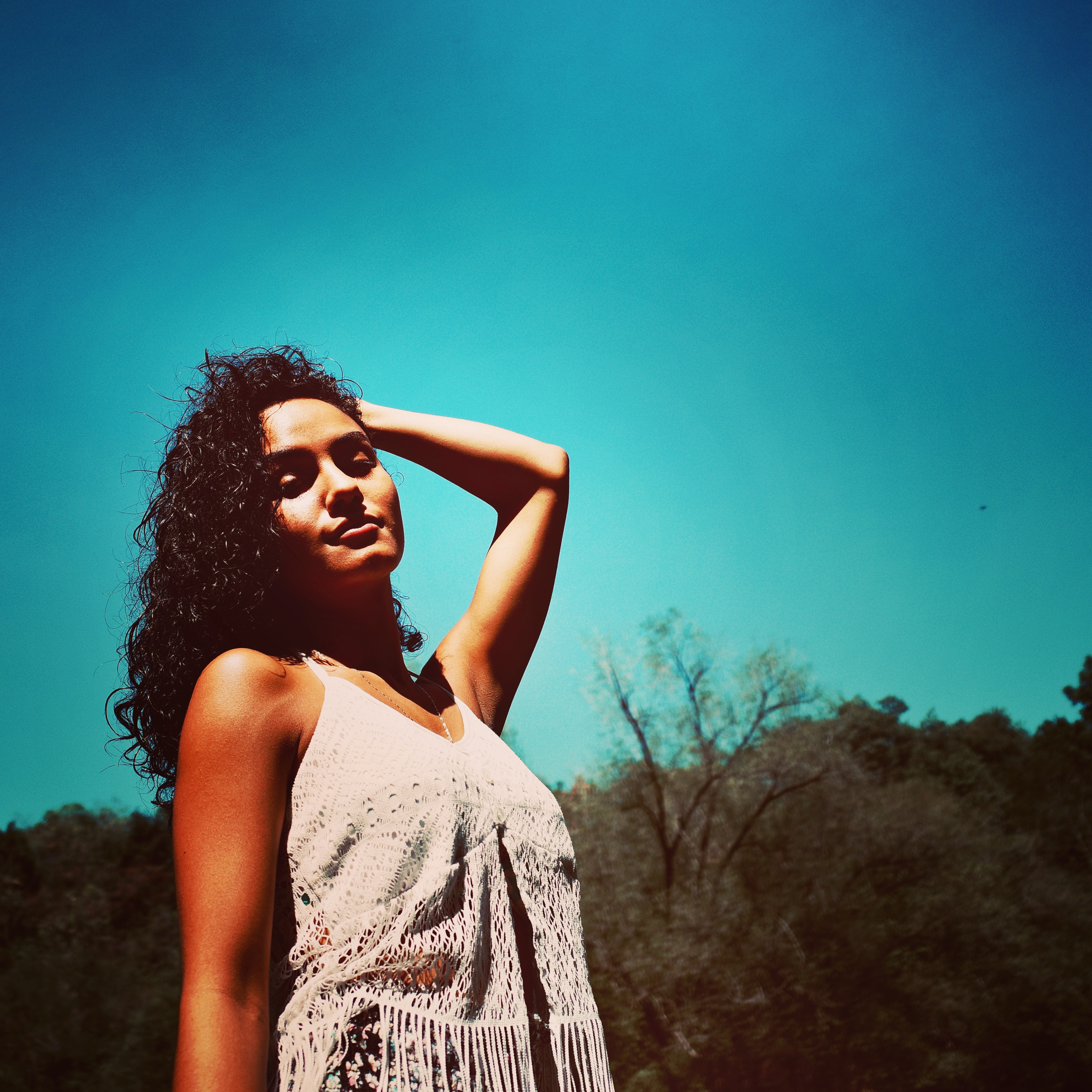 A striking portrait features a woman with curly hair basking in the sun, exuding a sense of confidence and freedom. The vibrant blue sky contrasts beautifully with her soft, bohemian attire, creating an uplifting and warm atmosphere. The composition draws the viewer's eye upwards, capturing a moment of serenity amidst nature's lush backdrop.
