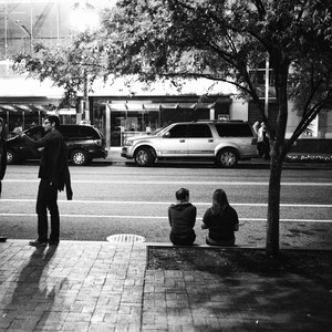 In this monochromatic scene, two figures sit on the curb, absorbed in their own world, while a group of people stands nearby, engaged in animated conversation. The contrast between the quiet contemplation of the seated duo and the lively interaction of the others evokes a sense of urban solitude amidst busyness. Soft ambient lighting from the storefront reflects off the pavement, adding depth and a touch of warmth to the night.