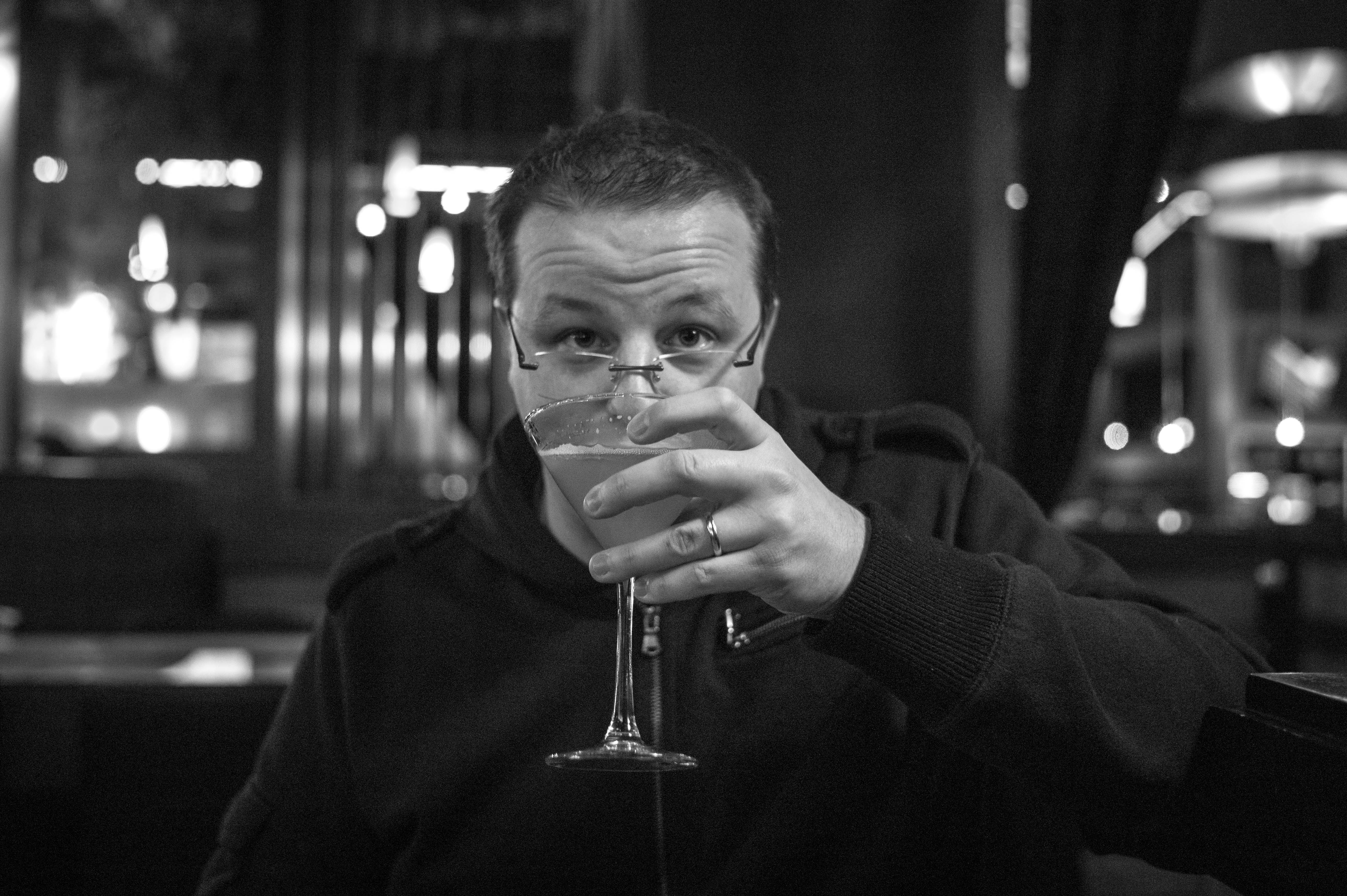 In this moody black-and-white photograph, a person raises a cocktail glass to their lips, partially obscuring their face with an air of intrigue. The soft lighting casts gentle shadows, enhancing the relaxed yet contemplative atmosphere of the indoor setting. The blurred background suggests an intimate space, inviting the viewer to ponder the emotions behind the mask of the glass and the thoughtful gaze of the individual.