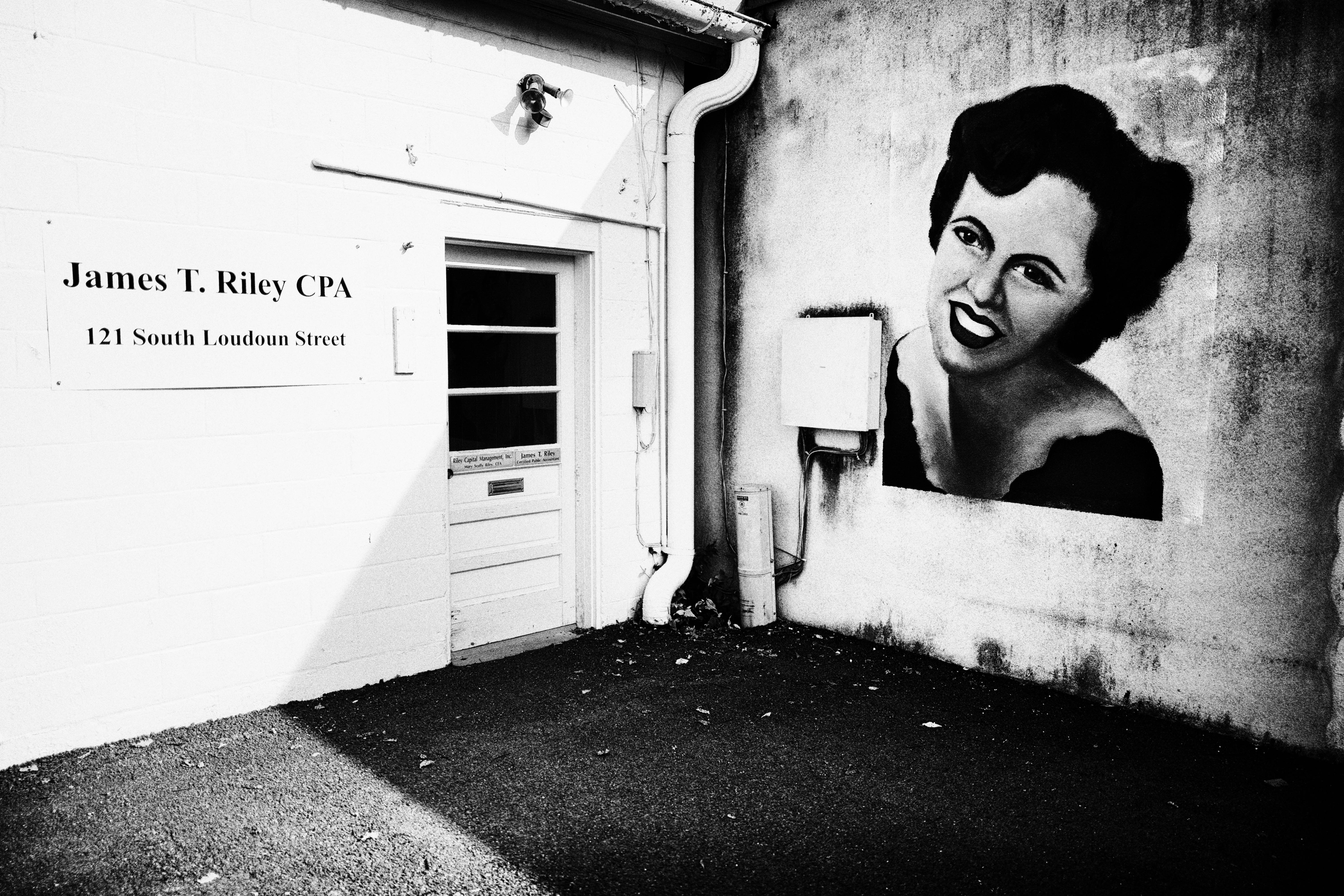 A striking mural of a smiling woman graces the wall beside the entrance of James T. Riley CPA, creating an unexpected focal point in this otherwise stark urban scene. The black and white composition enhances the contrast between the vibrant expression of the mural and the muted surroundings, evoking a sense of nostalgia and intrigue. Gentle light illuminates the subject, casting soft shadows that add depth to the mural's inviting gaze.