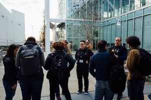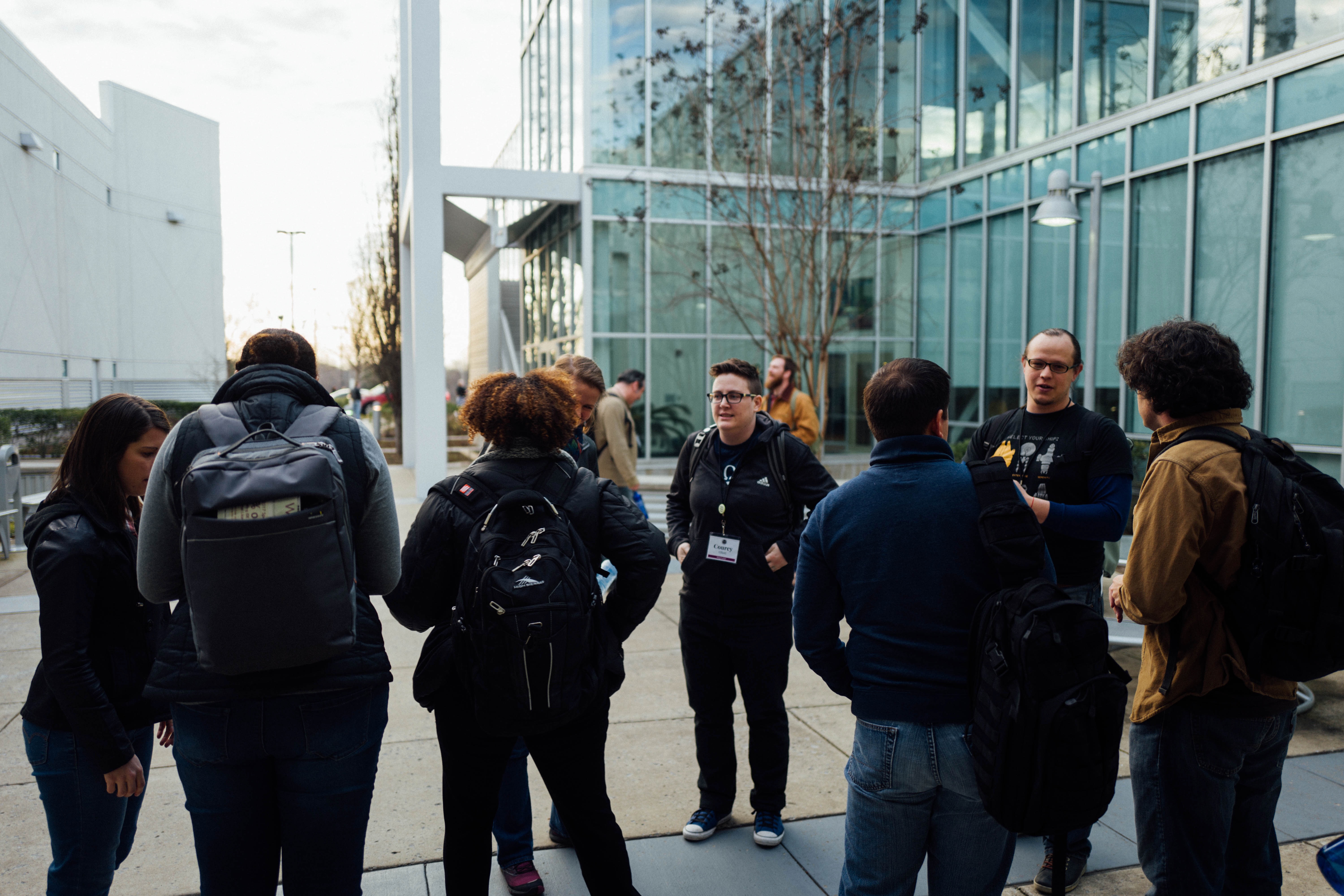 A group of individuals, primarily clustered around a central figure, engage in animated discussion outside a modern glass building. The warm, diffused light suggests a late afternoon ambiance, complementing the casual yet focused atmosphere of the gathering. The varied expressions and body language reveal a sense of camaraderie and shared purpose among the participants.