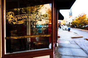 The photograph captures the inviting window of Benny Meletos, hinting at a cozy atmosphere within. Golden light glimmers off the window, reflecting the autumn colors outside and creating a warm, inviting mood. The composition expertly frames the entrance, drawing the viewer's eye toward the restaurant while hinting at the bustling street beyond.