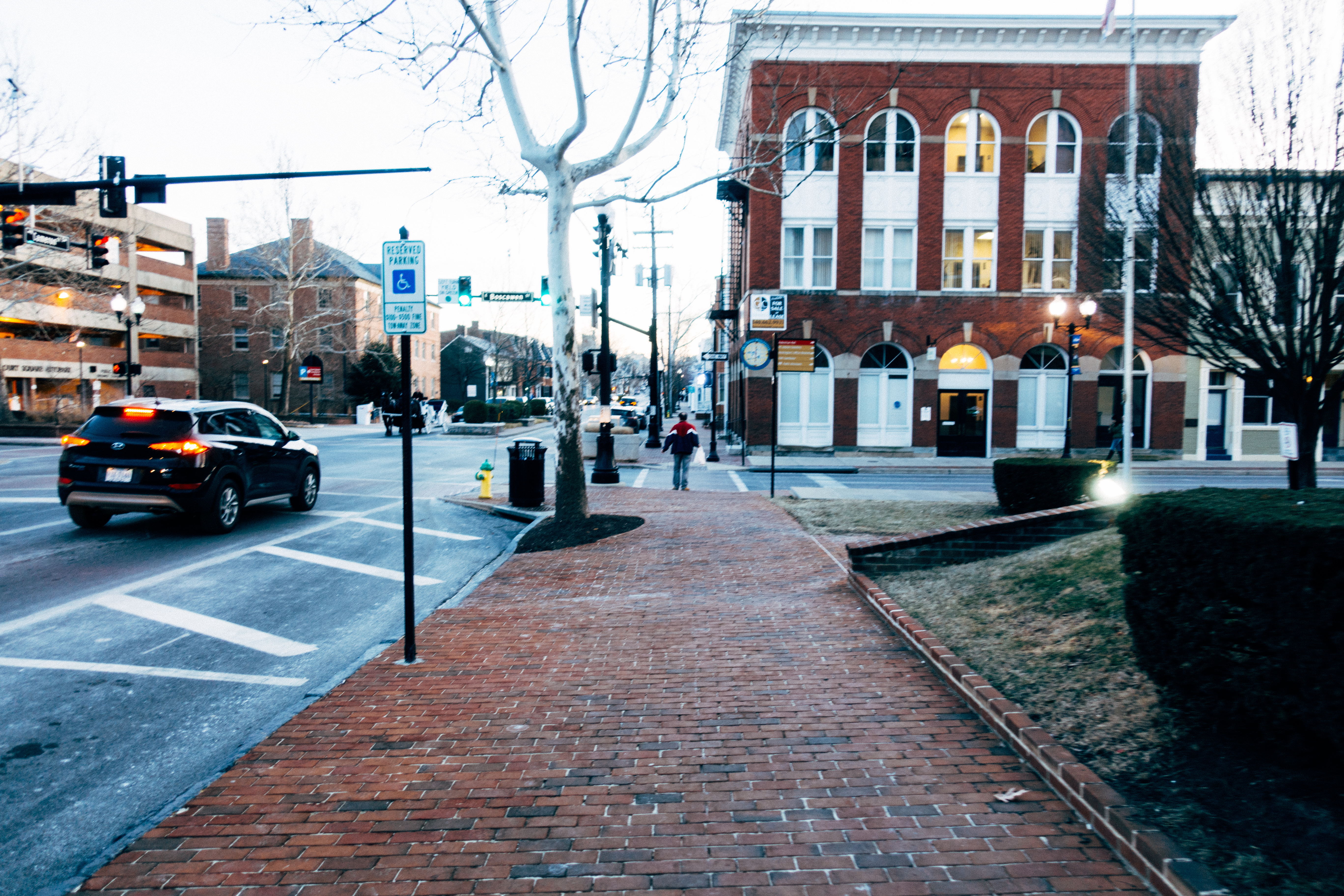 The photograph captures a serene street scene during twilight, where the warm glow of building lights contrasts with the cool evening sky. A solitary figure walks along the brick sidewalk, suggesting a moment of reflection amidst the gentle motion of passing cars. The composition invites the viewer to experience the calm yet vibrant ambiance of urban life transitioning into night.