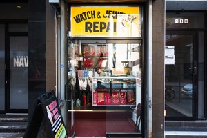 The photograph captures a quaint jewelry and watch repair shop, framed by an inviting yellow sign that draws attention. The warm interior light highlights a variety of sparkling necklaces and jewelry, creating a welcoming atmosphere, while a focused jeweler is seen working in the background. The composition effectively contrasts the vibrant display with the subdued surroundings, evoking a sense of craftsmanship and community.